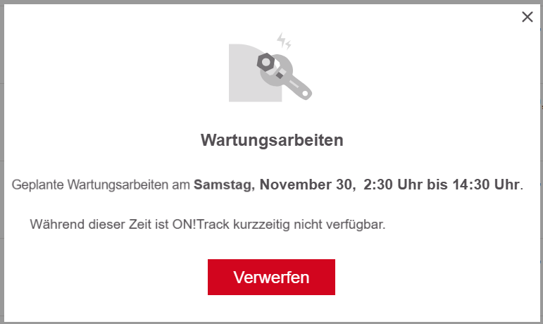Während des Wartungsfensters kann es zu vorübergehenden Unterbrechungen oder eingeschränktem Zugang zur ON!Track 3 Plattform kommen. Wir entschuldigen uns für etwaige Unannehmlichkeiten und bitten um Ihr Verständnis, während wir an der Verbesserung unserer Dienste arbeiten. Das Update betrifft wichtige interne Komponenten von ON!Track und zielt darauf ab, die allgemeine Stabilität und Zuverlässigkeit der Plattform zu verbessern.