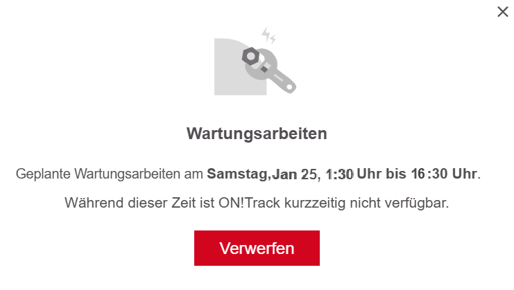 Während des Wartungsfensters kann es zu vorübergehenden Unterbrechungen oder eingeschränktem Zugriff auf die ON!Track 3-Plattform kommen. Wir entschuldigen uns für etwaige Unannehmlichkeiten und bitten um Ihr Verständnis, während wir daran arbeiten, unsere Dienste zu verbessern.