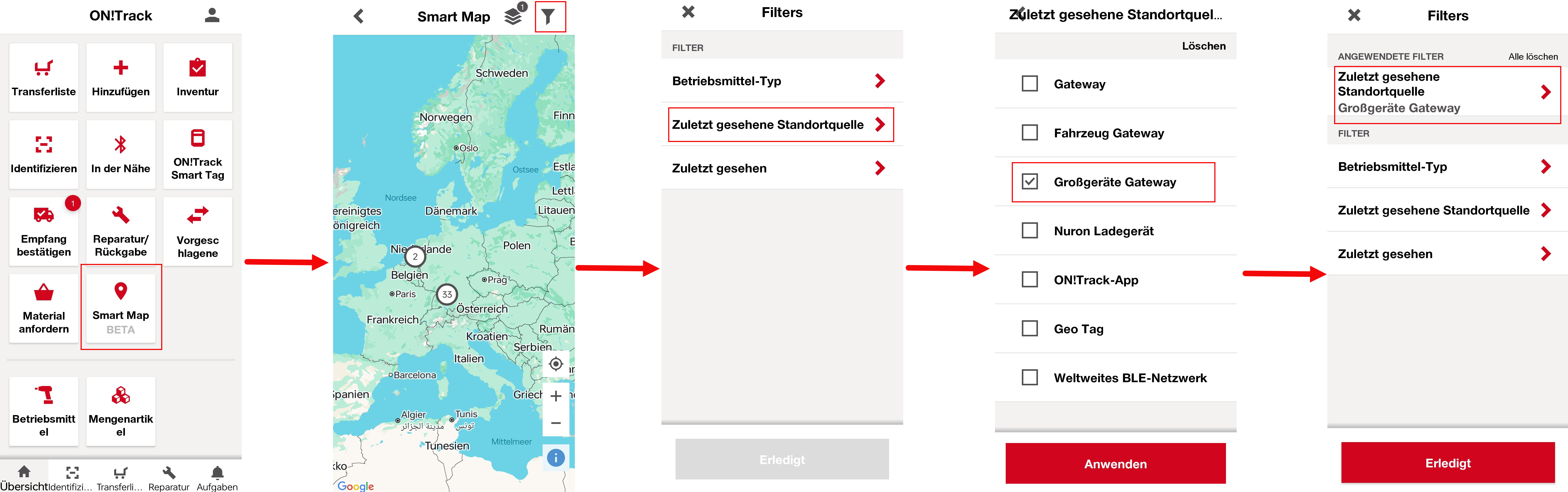 - Zuletzt gesehene Quelle: Abhängig von Ihrem ON!Track-Lizenztyp können Sie nach Quellen wie Nuron Ladegeräten, ON!Track-App, Weltweites BLE-Netzwerk, Gateways, Fahrzeug-Gateways, Großgeräte-Gateways, Geotags und mehr filtern.