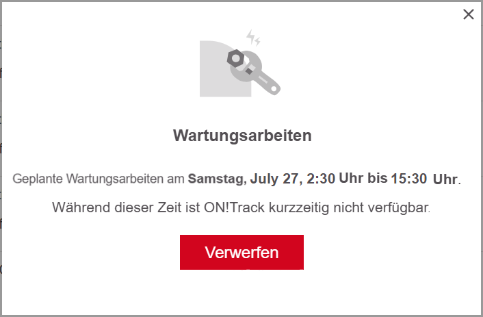 Während des Wartungsfensters wird die ON!Track 3-Plattform für alle Nutzer nicht zugänglich sein.