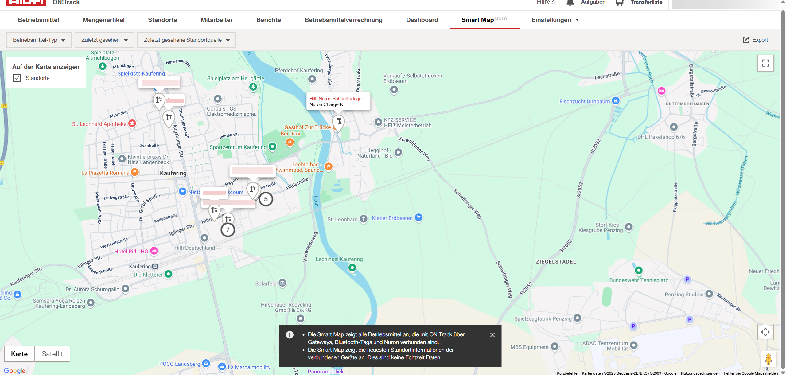 Sie können jetzt Standorte, einschließlich Gateway-aktivierter Lager und Baustellen, auf der Registerkarte Smart Map mit einem einfachen Kontrollkästchen aktivieren. In dieser ersten Iteration werden alle Standorte (aktiv, inaktiv und Gateway-aktiviert oder nicht) zur besseren Verfolgung angezeigt.