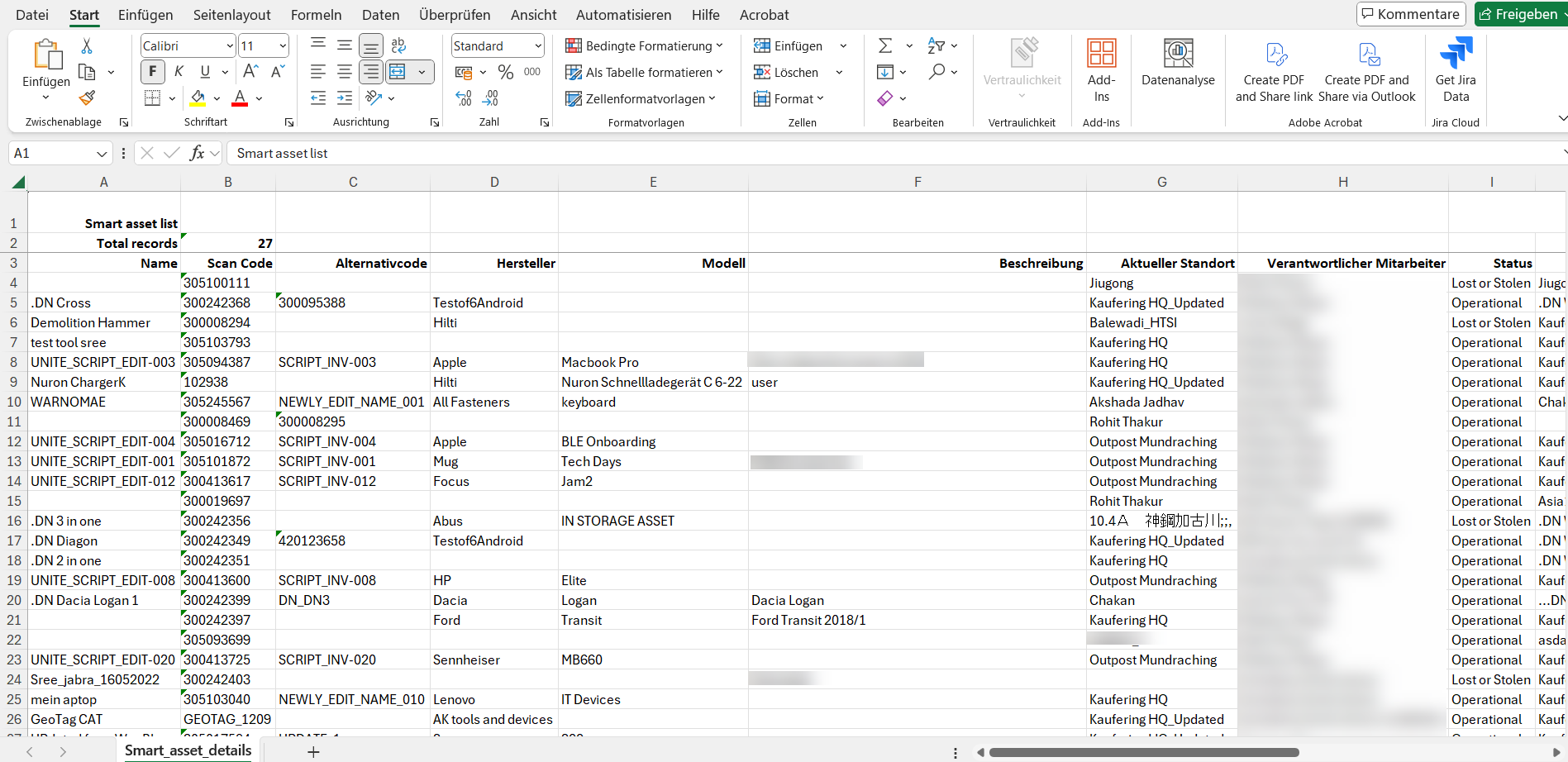 Exportieren Sie eine Liste aller verbundenen Geräte mit der zuletzt gesehenen Zeit und Quelle (z. B. Gateways, Bluetooth Smart-Tags, Nuron) direkt aus der Smart Map.