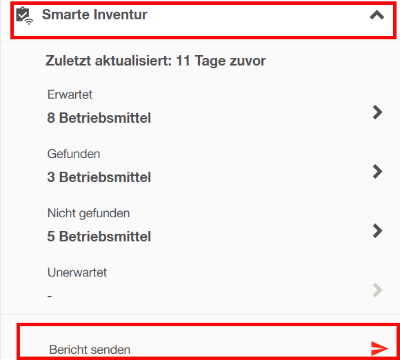 - Klicken Sie auf das Dropdown-Menü Smarte Inventur, um eine Ansicht der Listen der erwarteten, gefundenen, nicht gefundenen und unerwarteten Betriebsmittel zu erhalten. Scrollen Sie nach unten, um die Schaltfläche Bericht senden zu finden.