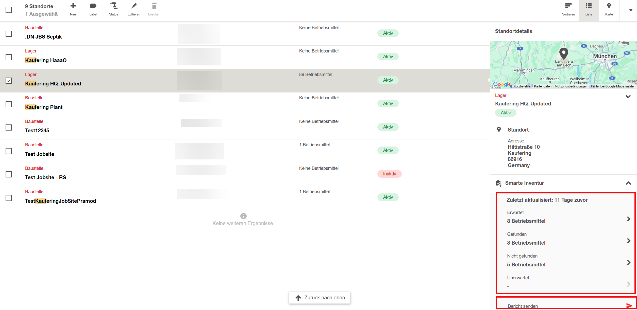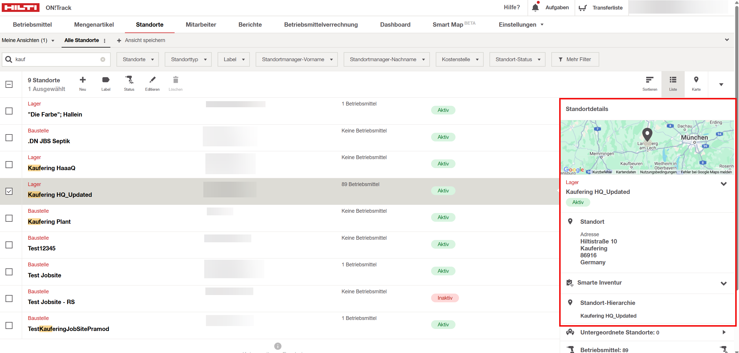 Klicken Sie auf den gewünschten Standort, um dessen Details anzuzeigen, einschließlich der Standort-Hierarchie, der Adresse und der Informationen zur Smarte Inventur.