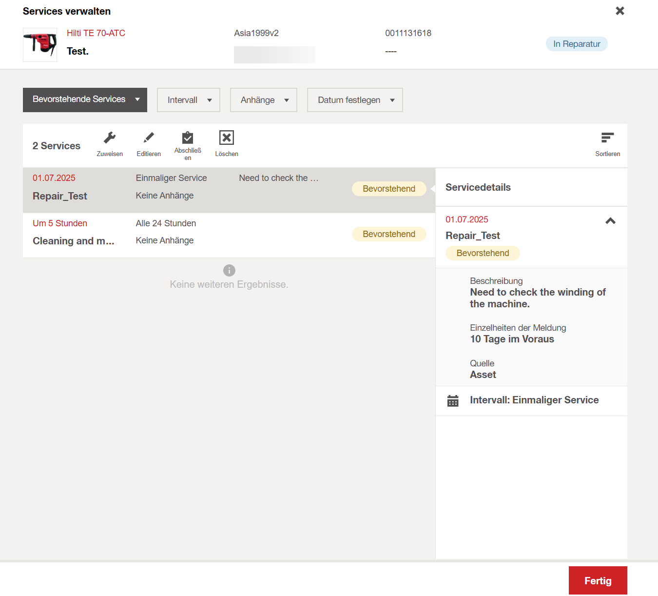 Status-Updates: Hilti Werkzeuge erhalten jetzt automatische Status-Updates, wenn sie repariert werden.