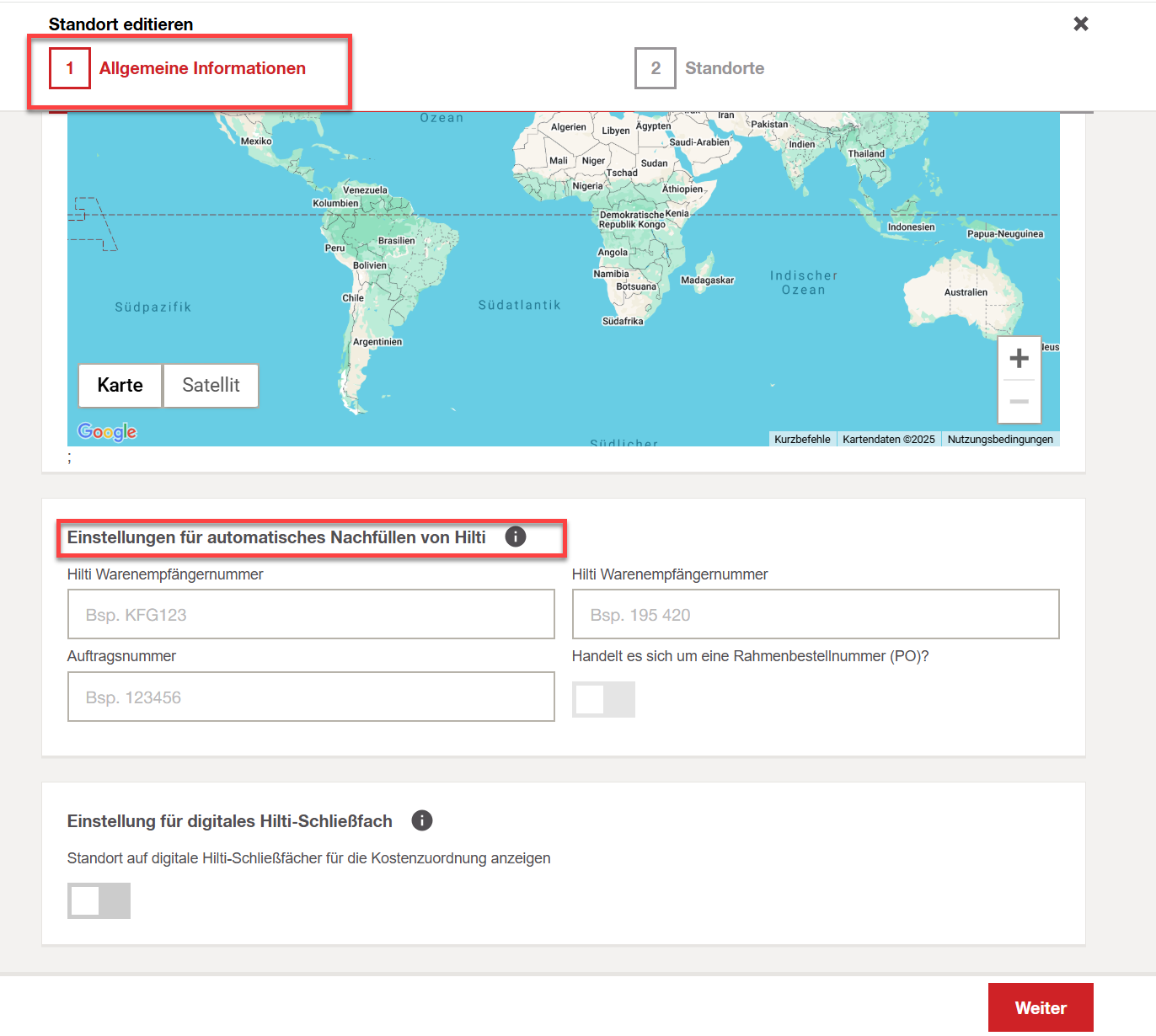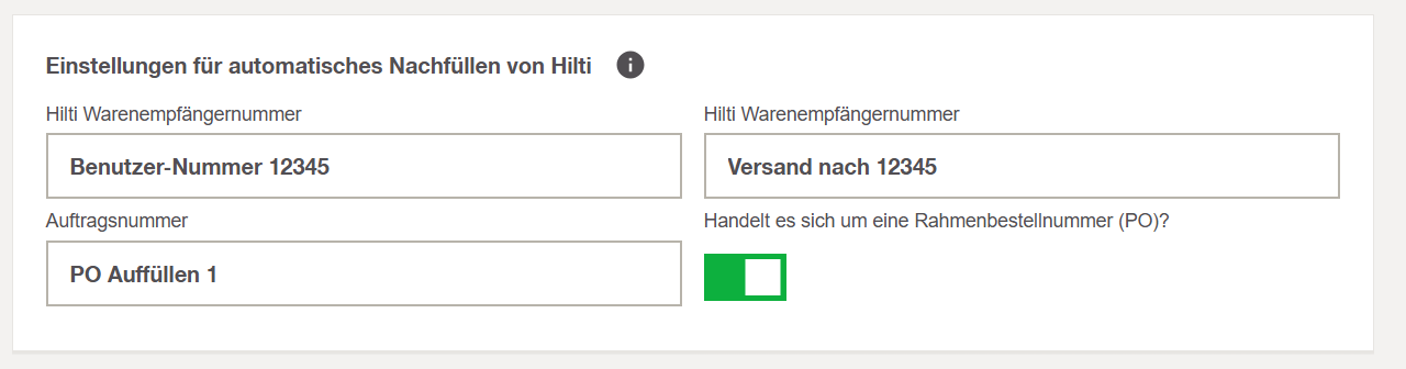 - Vergewissern Sie sich, dass der Abschnitt "Einstellungen für das automatische Nachfüllen von Hilti" korrekt ausgefüllt ist.