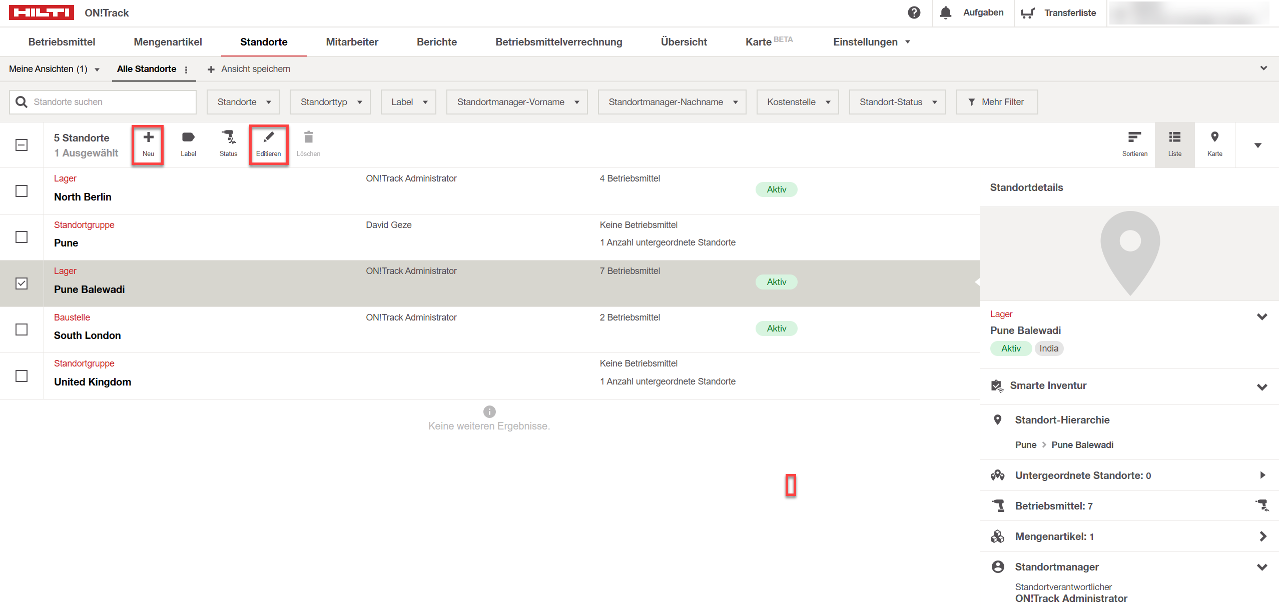 - Gehen Sie in ON!Track auf die Registerkarte "Standorte" und klicken Sie auf das "+"-Zeichen, um einen neuen Standort hinzuzufügen, oder wählen Sie einen vorhandenen Standort aus und klicken Sie auf "Editieren", um seine Details zu ändern.