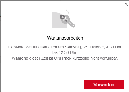 Während des Wartungszeitraums kann es zu vorübergehenden Unterbrechungen oder Einschränkungen beim Zugriff auf die ON!Track 3-Plattform kommen. Wir entschuldigen uns für etwaige Unannehmlichkeiten und bedanken uns für Ihr Verständnis, während wir daran arbeiten, unsere Dienste zu verbessern.