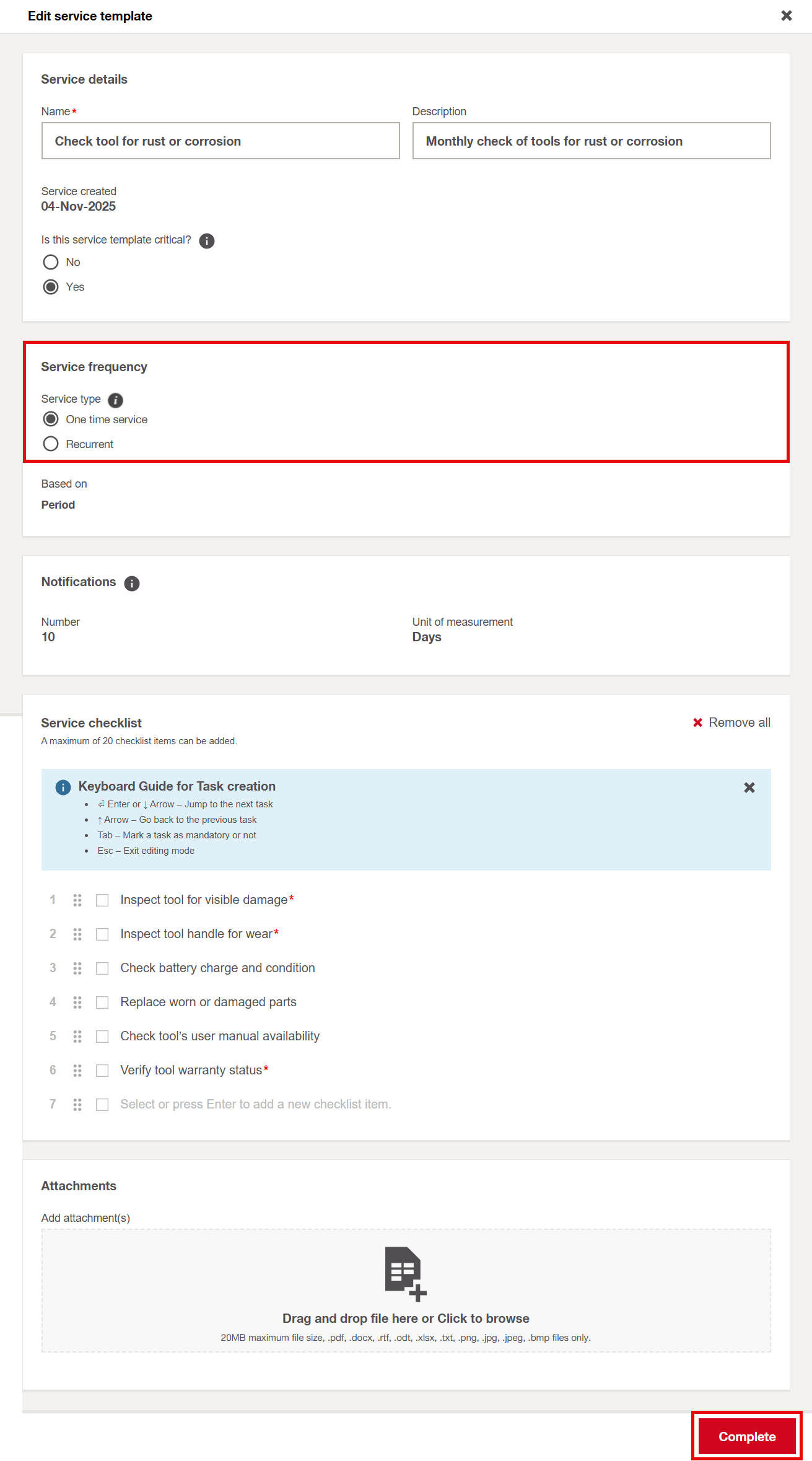 - Zuweisung eines lebenslangen Service: Sie können einem Betriebsmittel einen einmaligen Service zuweisen und diesen später in einen lebenslangen Service ändern.