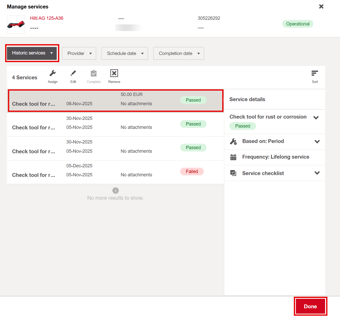 - Serviceabschluss: Nach Abschluss wird der Service im Serviceverlauf angezeigt und als „Lebenslang“ gekennzeichnet.