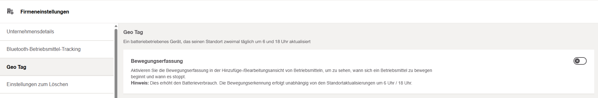 Die „Geo Tag Bewegungserkennung“ muss durch einen Administrator in den ON!Track Firmeneinstellungen aktiviert werden. "