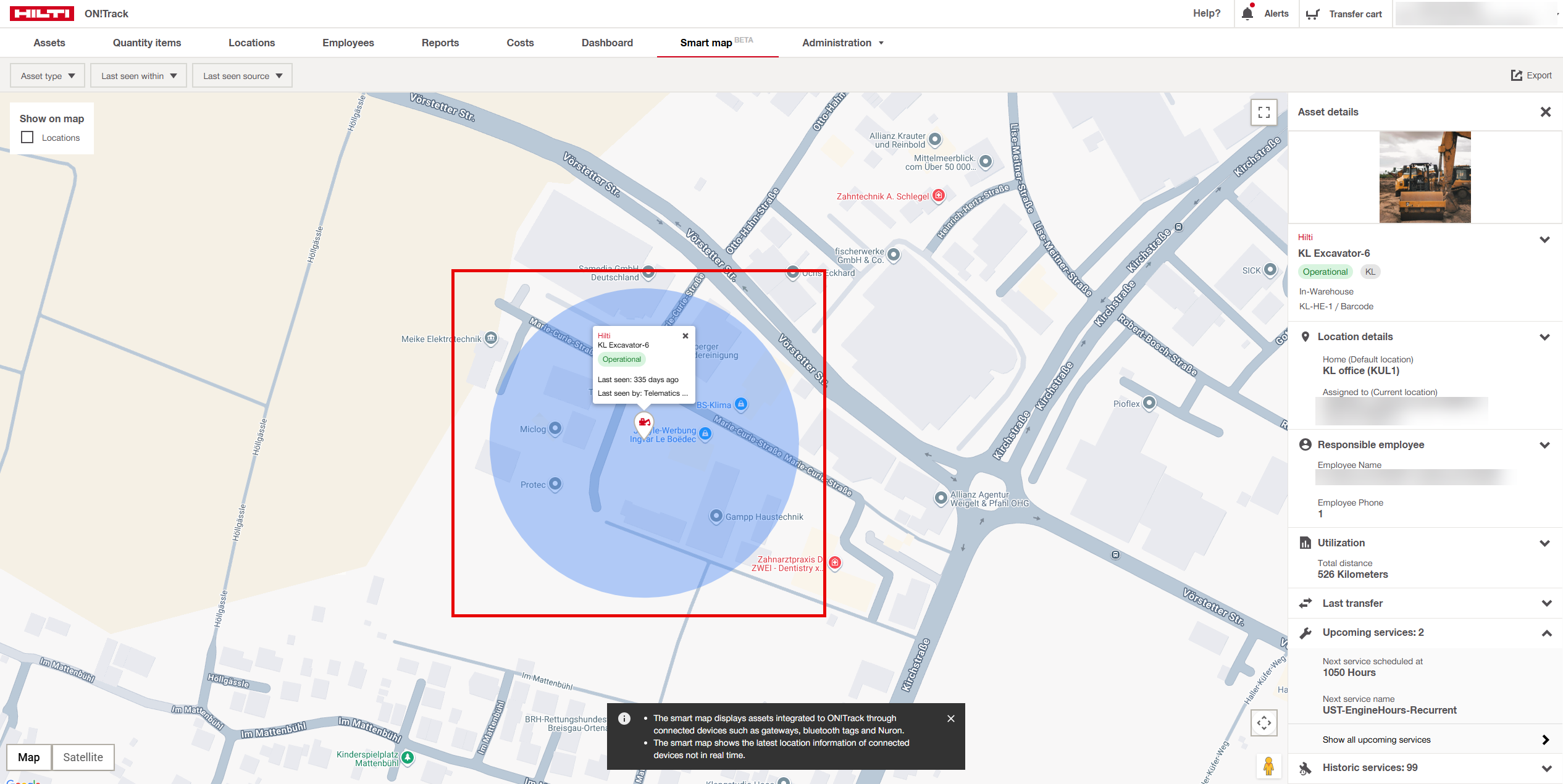 When you open the Smart Map, you will only see tools that are active, tagged, or Iot-enabled (e.g., Nuron). Tools will show their latest location only if there is an update from a Gateway scan, the ON!Track app, or a Nuron charger.