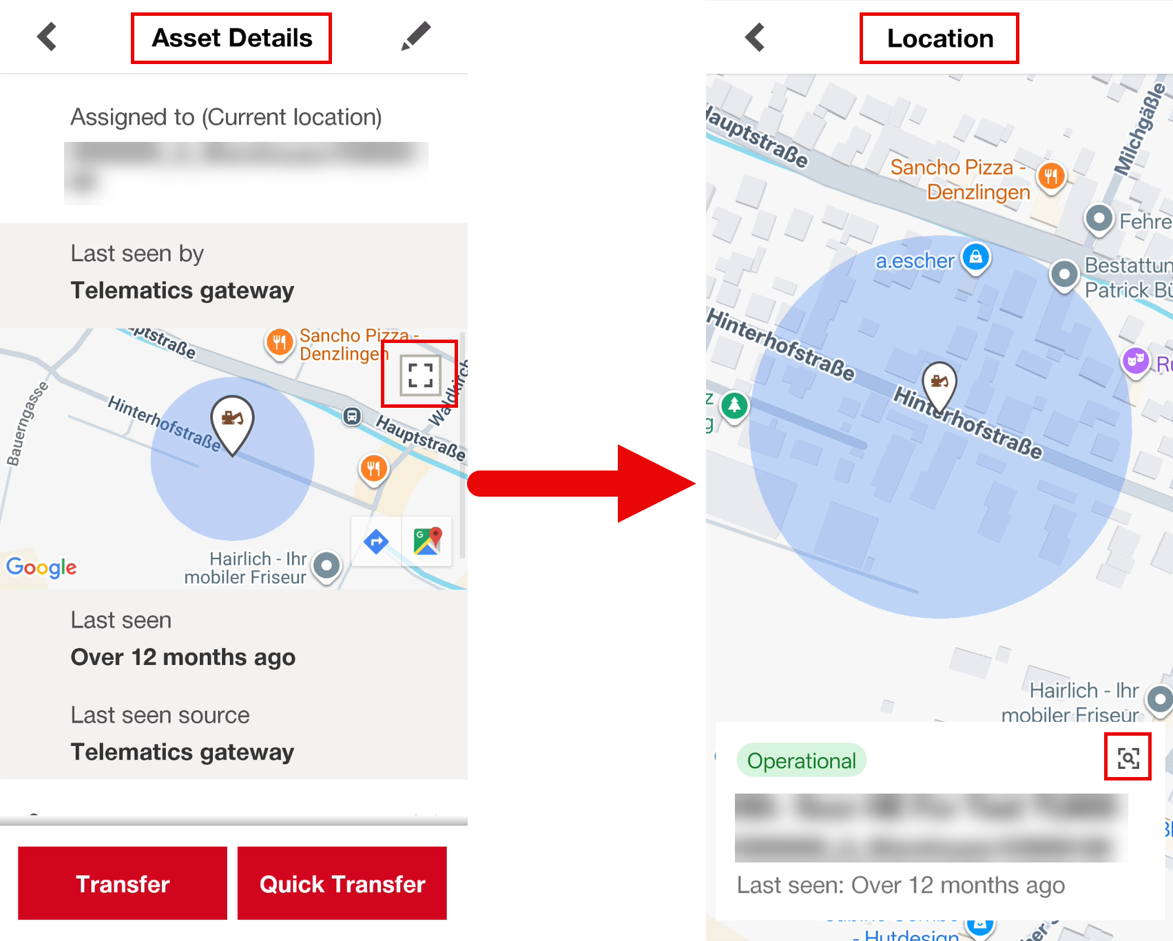 • When viewing a selected asset in full screen, double‑clicking its pin zooms in further and shows more map details, including the accuracy circle (if available).