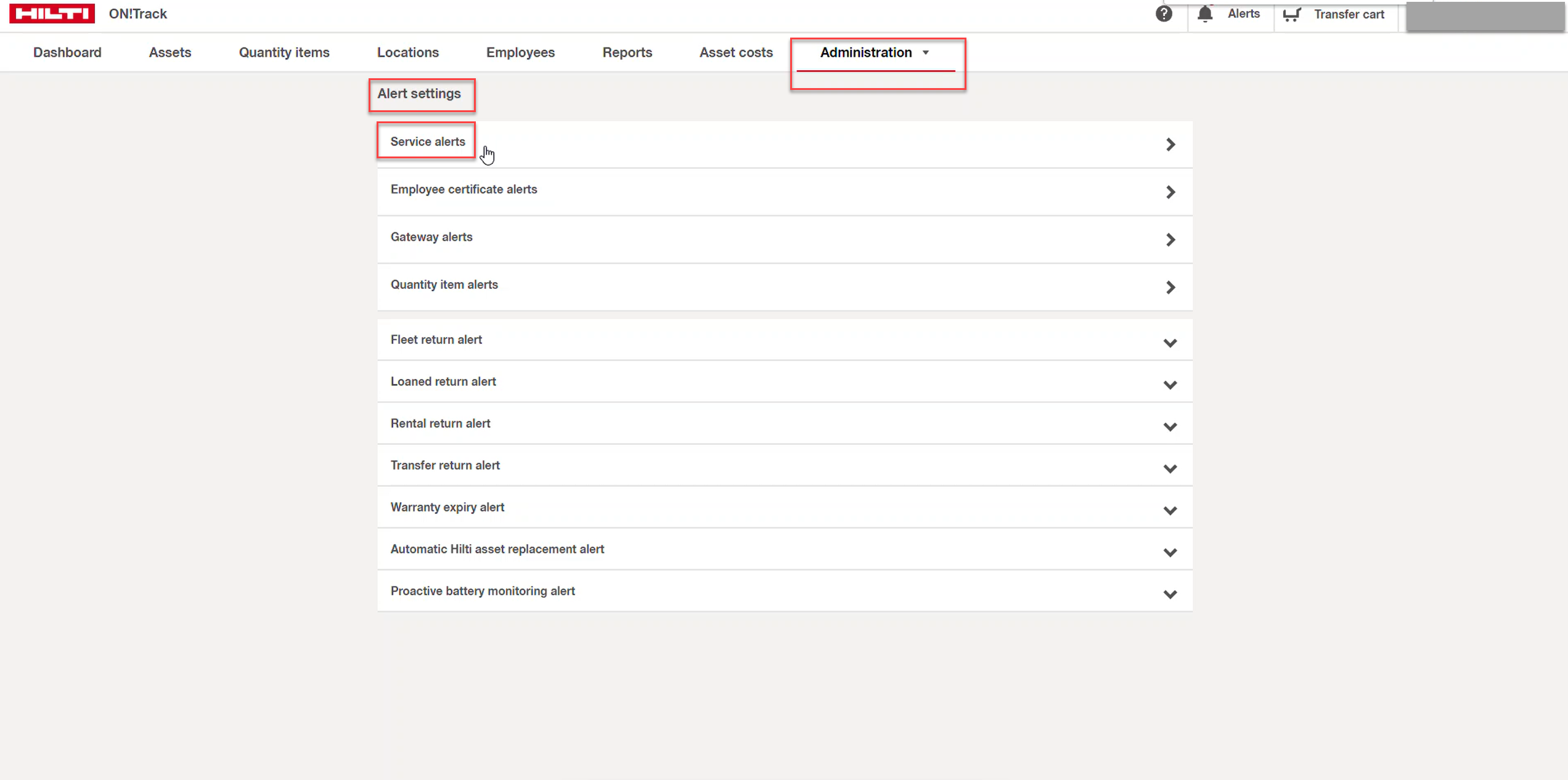 - To update the Notifications, go to the tab Administration → General → Alert settings and click on Service Alerts.