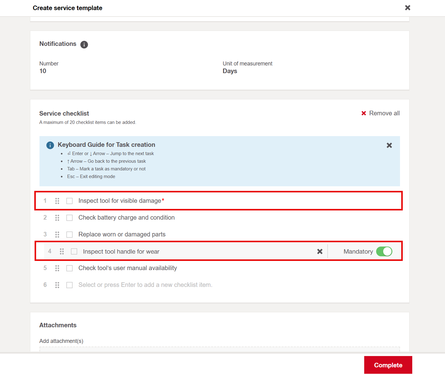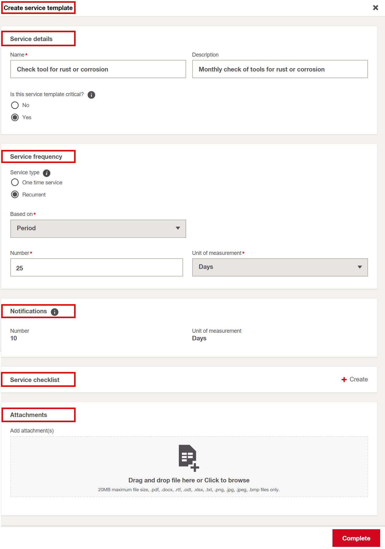 Enter the Name, Description, Service Frequency, Notifications, and Attachments. Then, click "Complete" to save the service template.