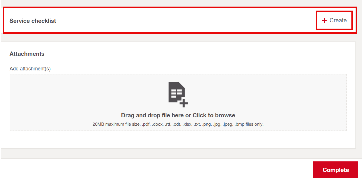 Scroll to the "Service Checklist" section and click "Create" to start adding checklist items.