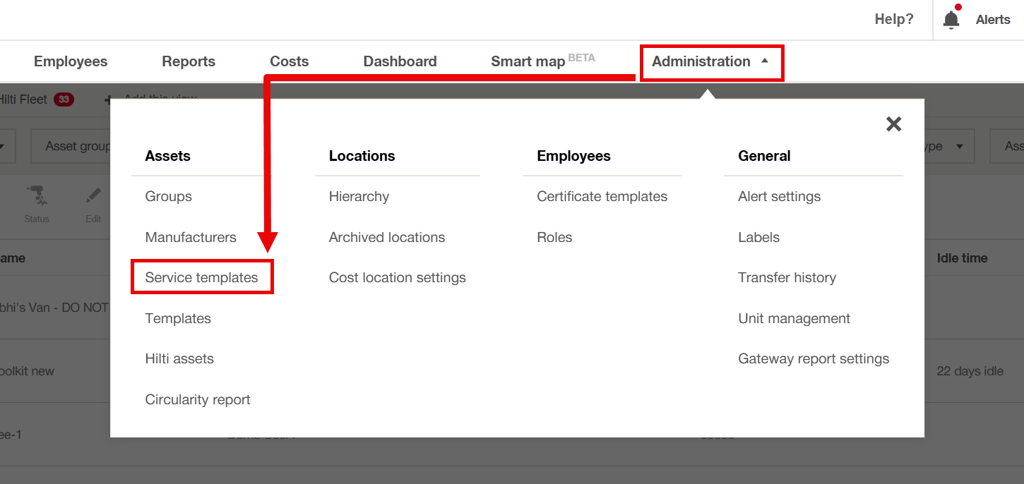 Click on the "Service Templates" from the tab Administration --> Assets.