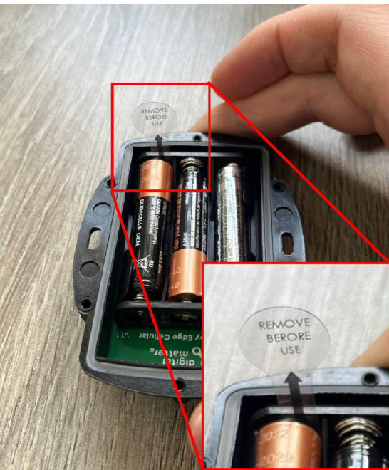 • Activate the device: Remove the plastic rip strip as shown in the picture below.
