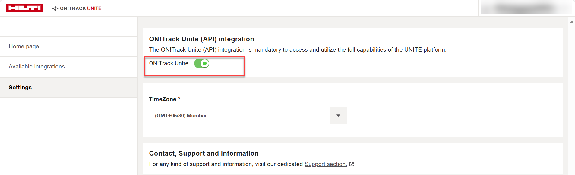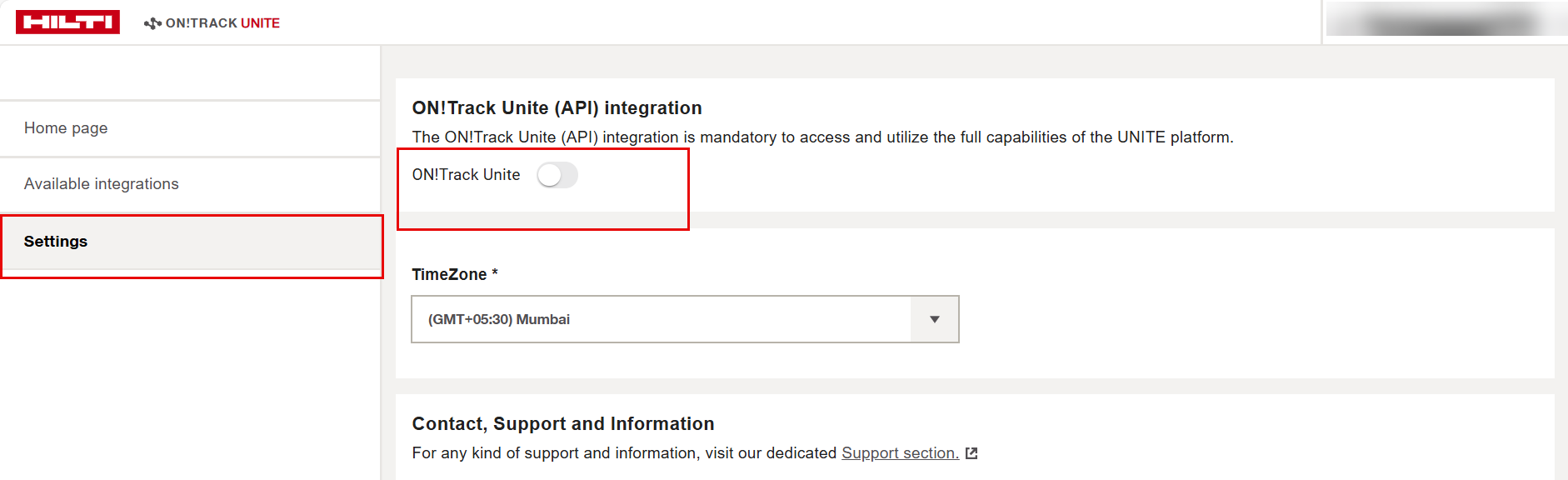 • The ON!Track Unite toggle is disabled by default.