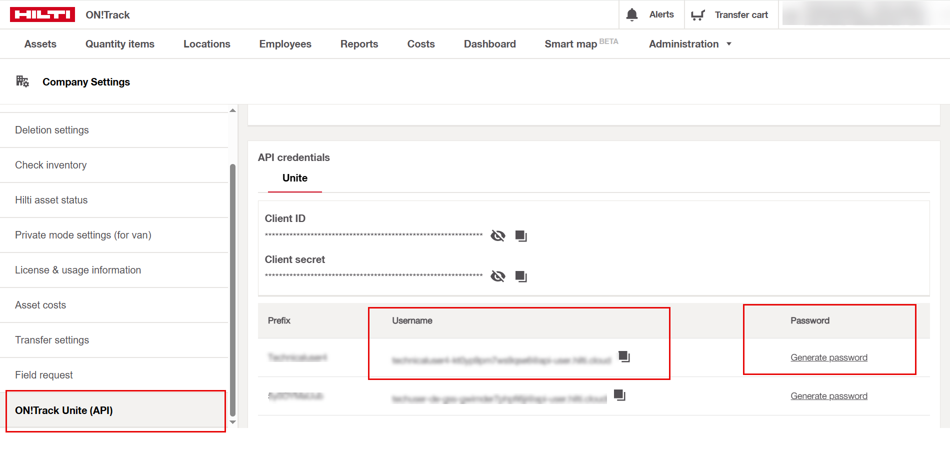 • The fields ‘Username’ & ‘Password’ can be fetched from ON!Track under ‘Company Settings’ as shown below: