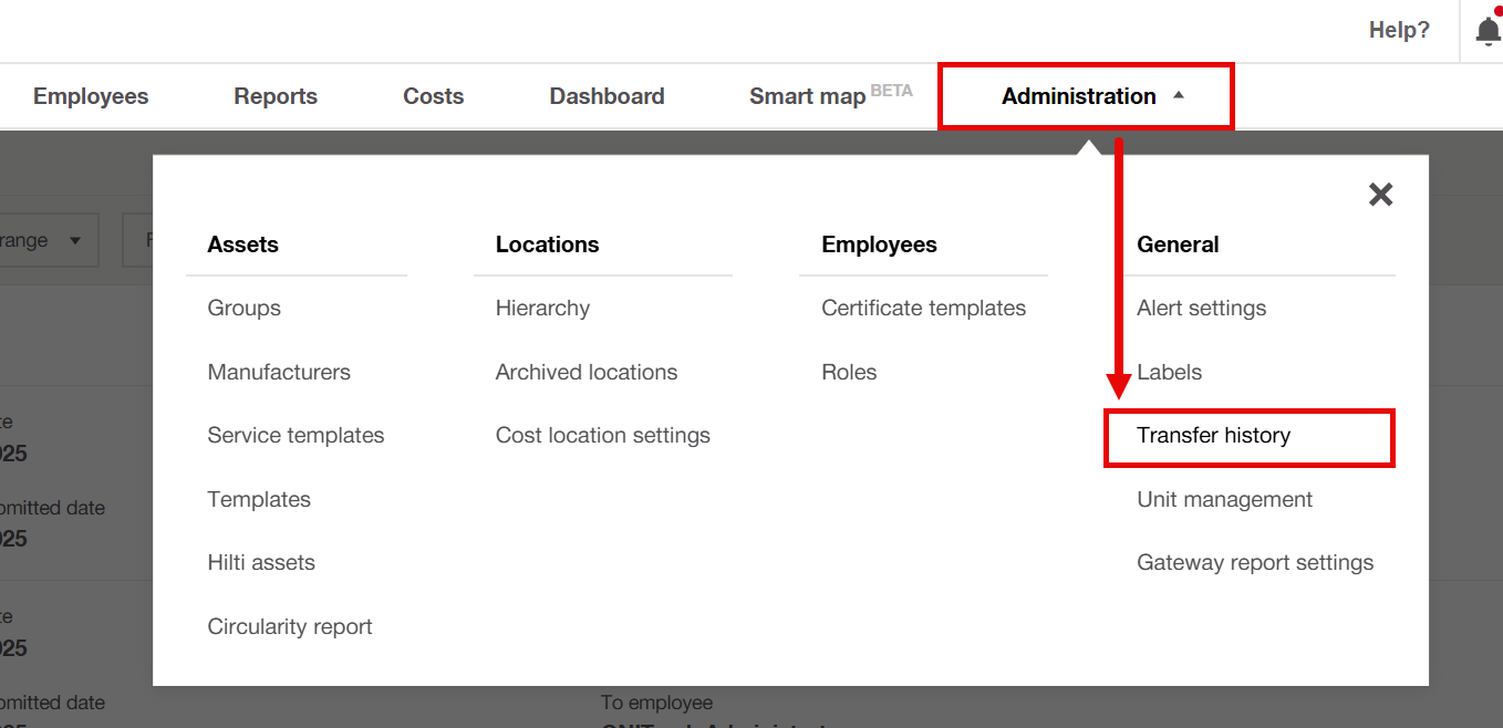 To download and view the transfer delivery note, go to the Administration tab and click on Transfer History.