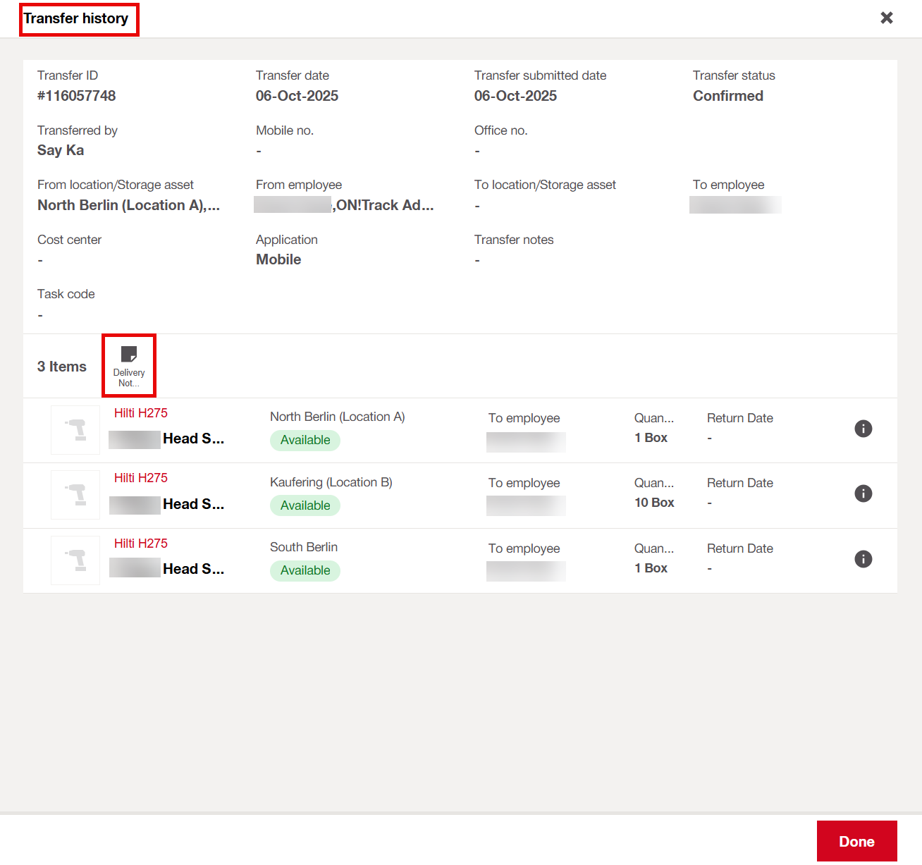 Additionally, delivery notes can be downloaded at any time from the transfer history screen on the web platform, supporting transparency and accountability in asset management.