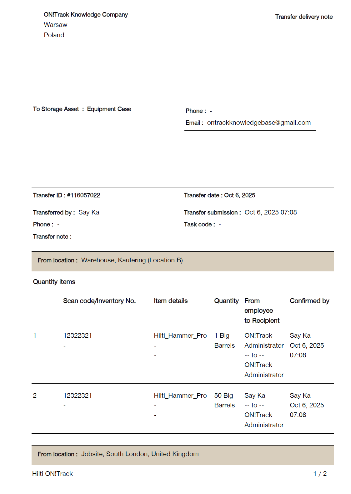 The delivery note is automatically emailed to both the person conducting the transfer and the recipient, ensuring awareness.