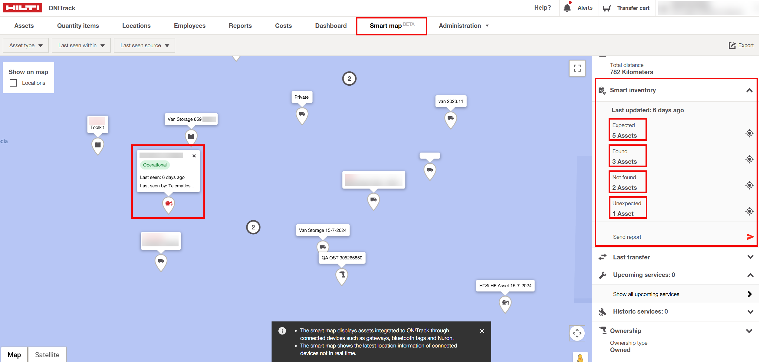 On the Smart map, you can currently access smart inventory for vehicles and heavy equipment. In the future, you’ll also be able to see inventory for locations.