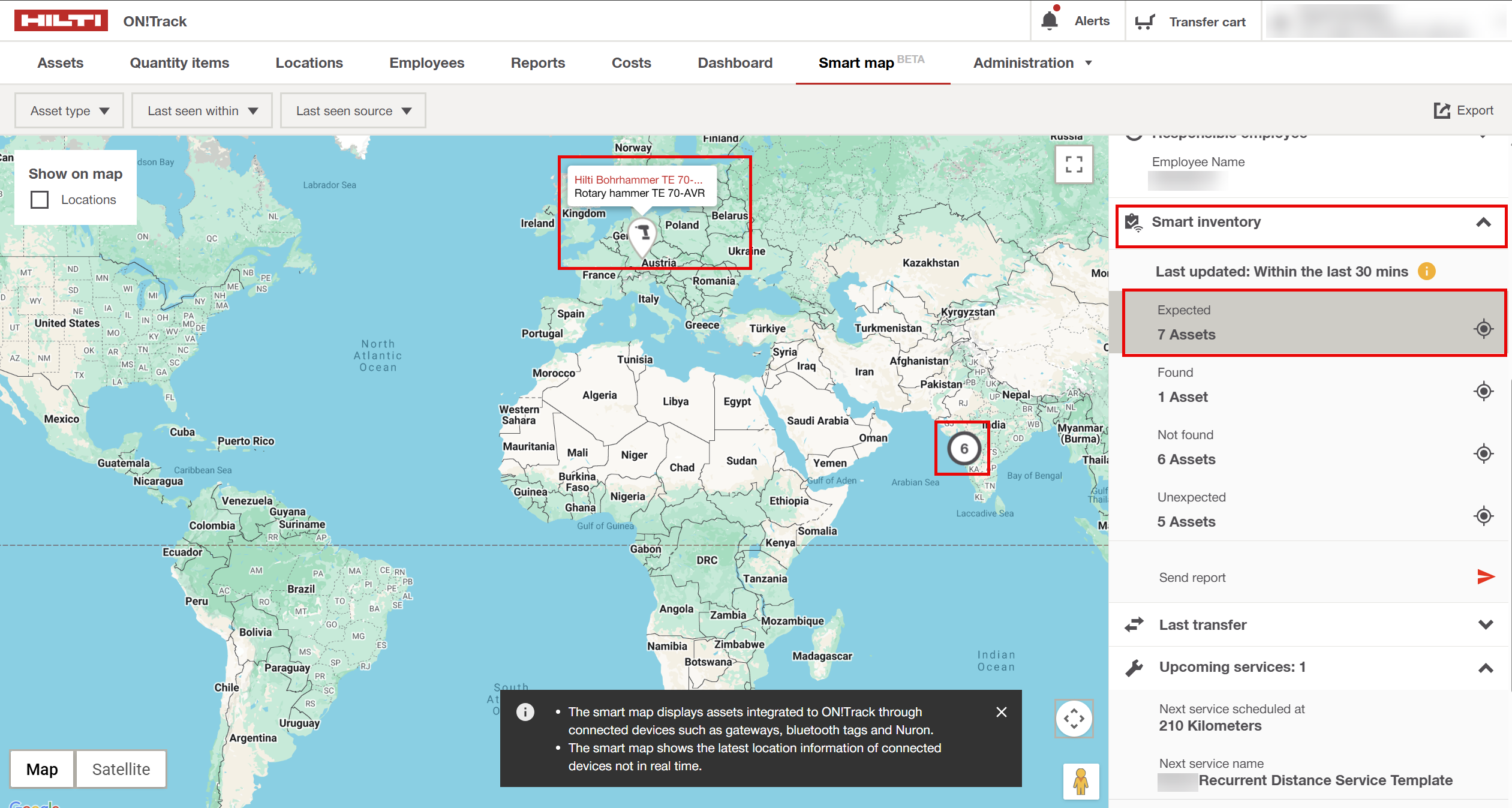 Smart Inventory on the Smart Map helps you quickly understand which assets are expected, found, not found, or unexpected inside a Van, Heavy Equipment (HE), or Container. You can access this information directly from the map without switching screens