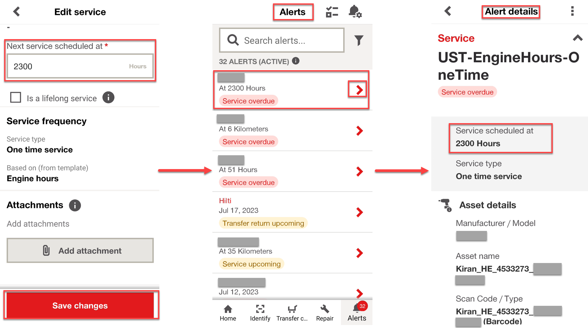 Update the field (Next service scheduled at) and click “Save Changes.” You’ll find the updated service in the alerts tab. Click on it to view the details.