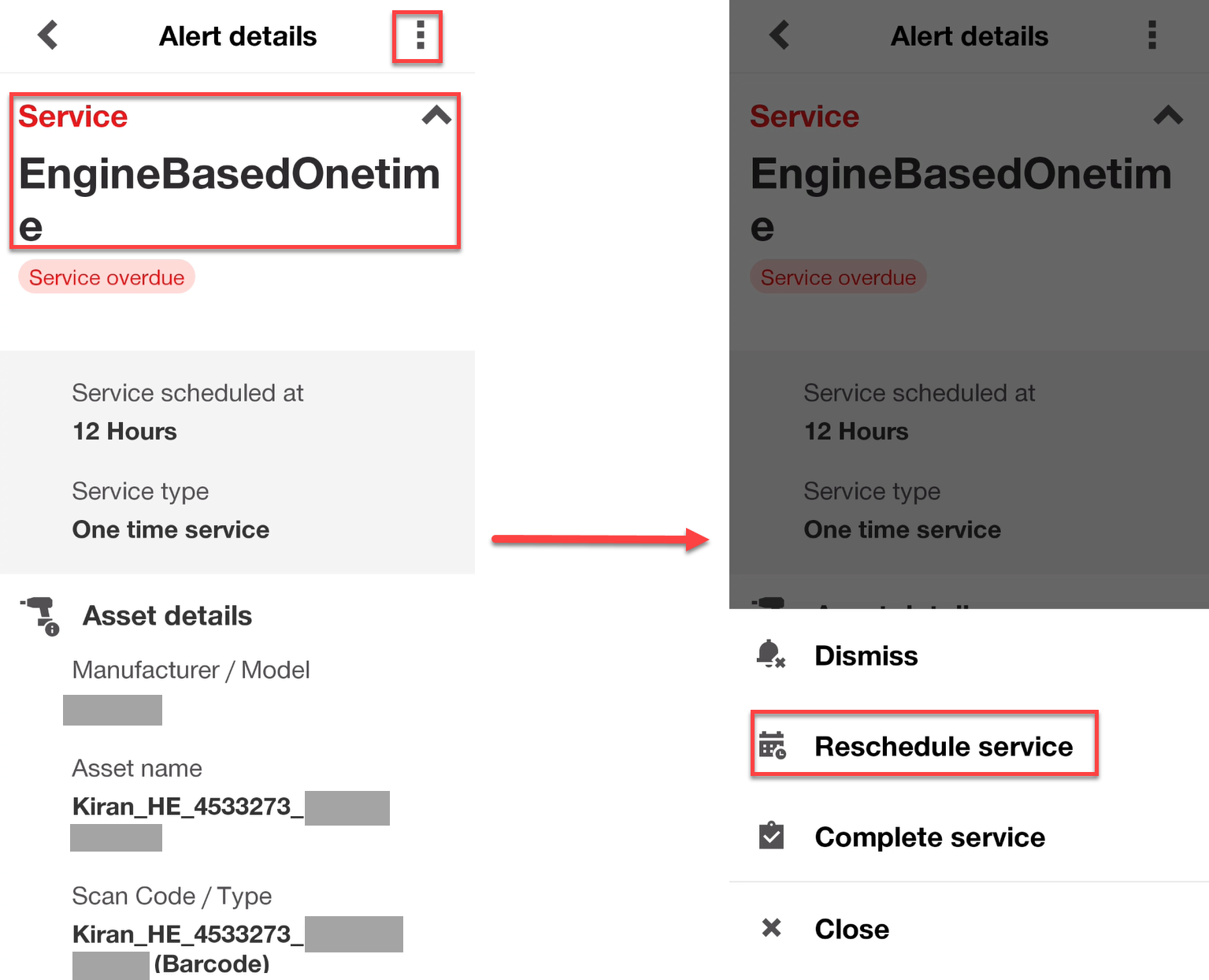 Select the alert, click the three dots, and choose "Reschedule Service" to finish the service.