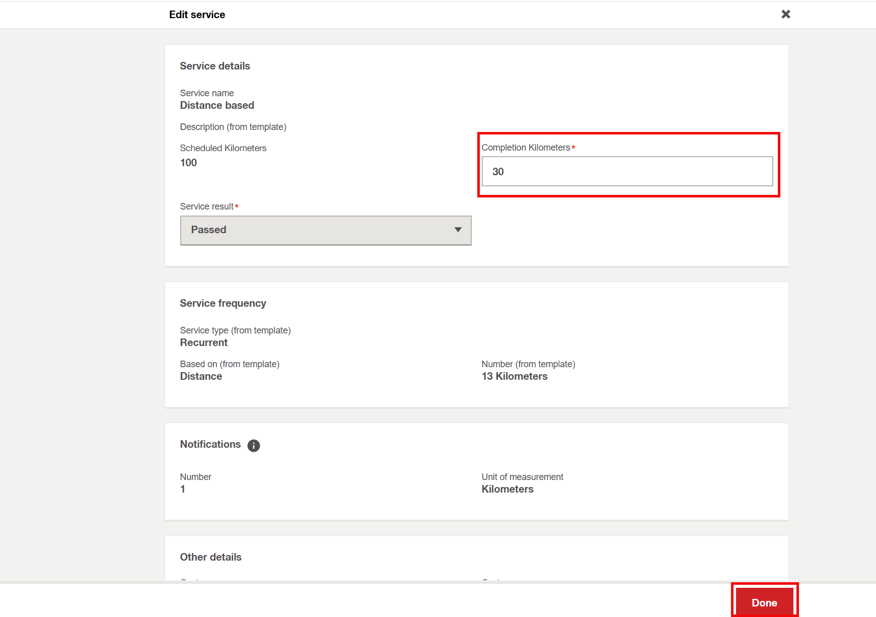 Note - If you edit "Completion kilometres" or "Completion hours" on the most recent completed instance of a recurring service, the schedule for the next instance of that service will be updated to match the change.