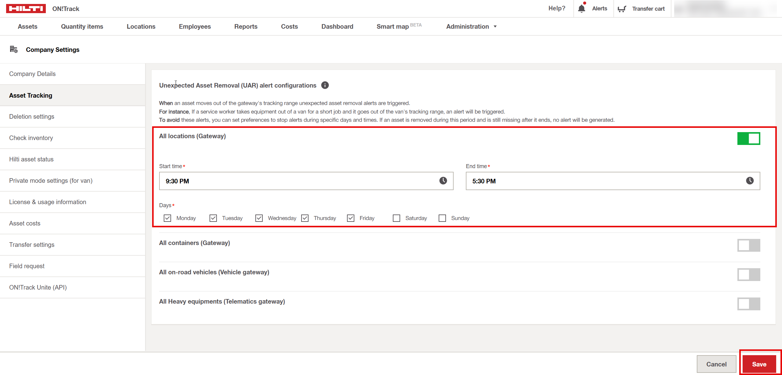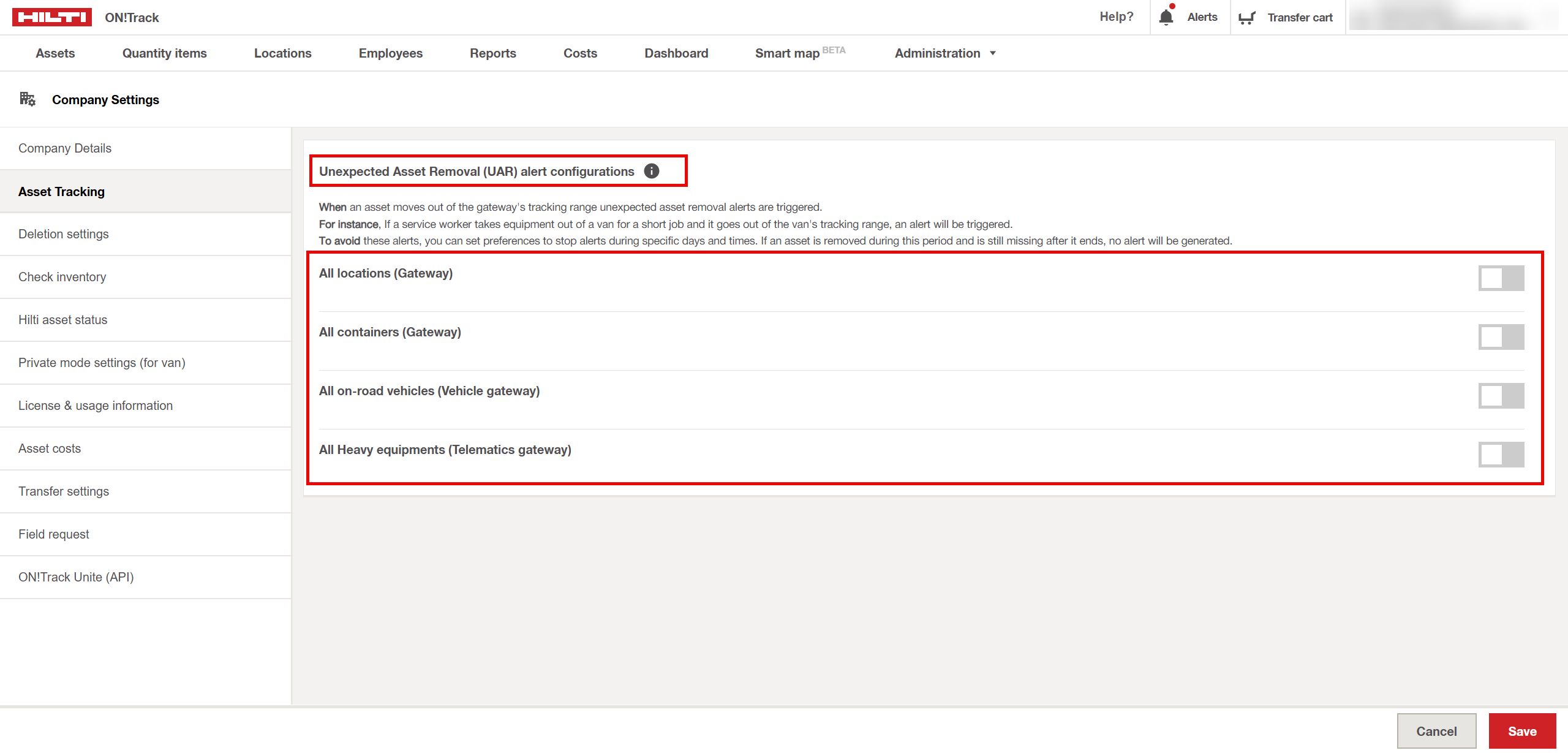 - Go to Company Settings and open Asset Tracking. In the Unexpected Asset Removal (UAR) Alert Configuration section.