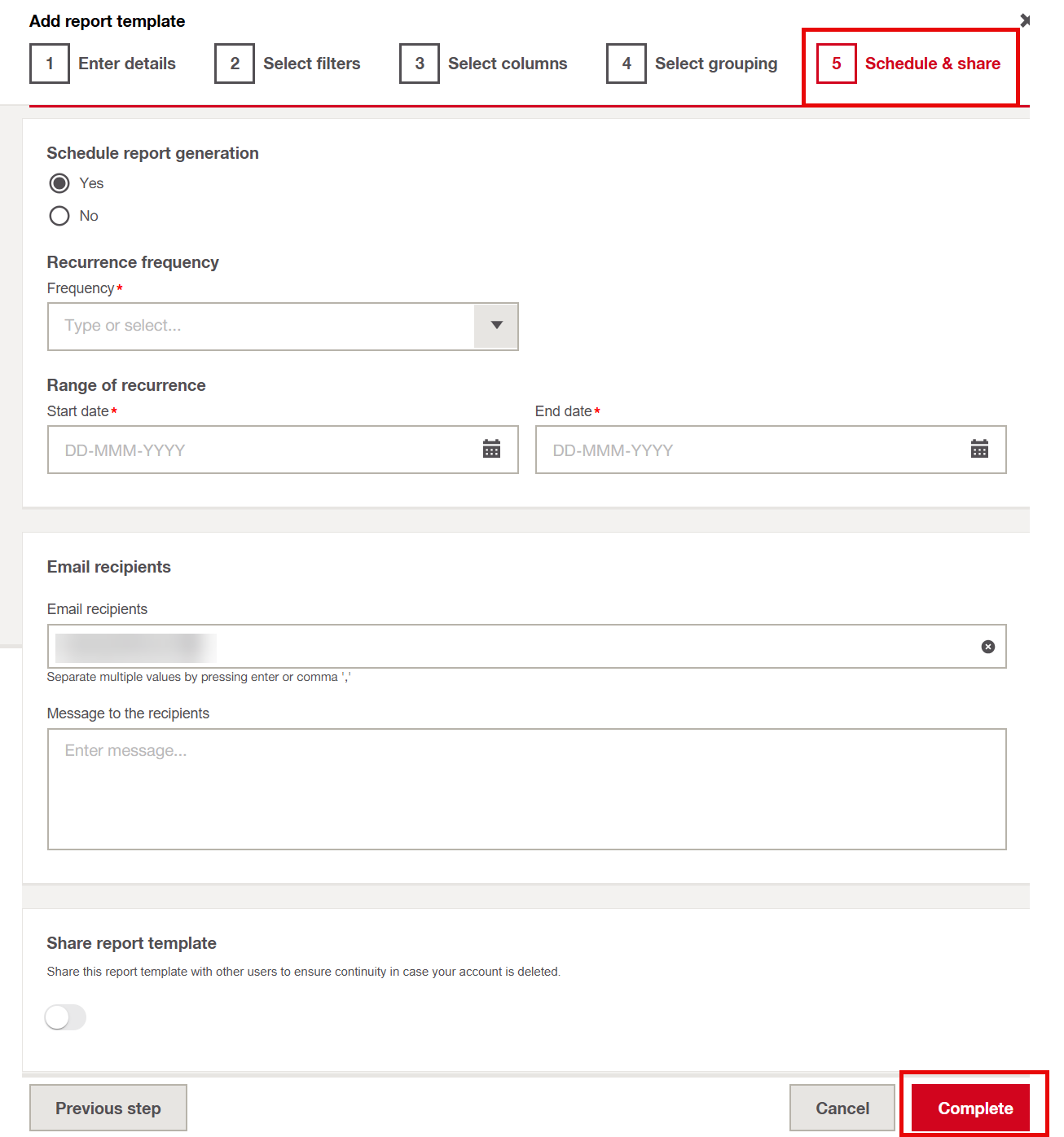 Here you can define whether they want this report to be generated just once, or on a recurring basis. This can be: Daily, Weekly or Monthly.