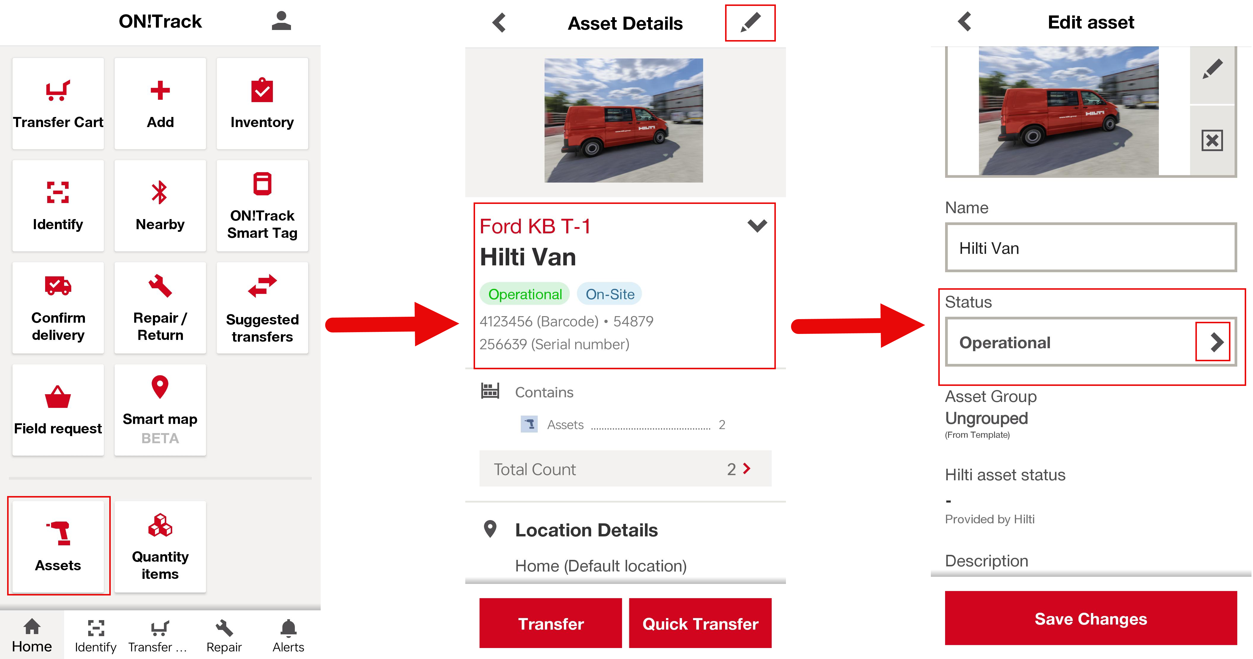 - Open the ON!Track mobile app, go to Assets , select the asset, click on edit, and choose Change Status (e.g., "In Repair").