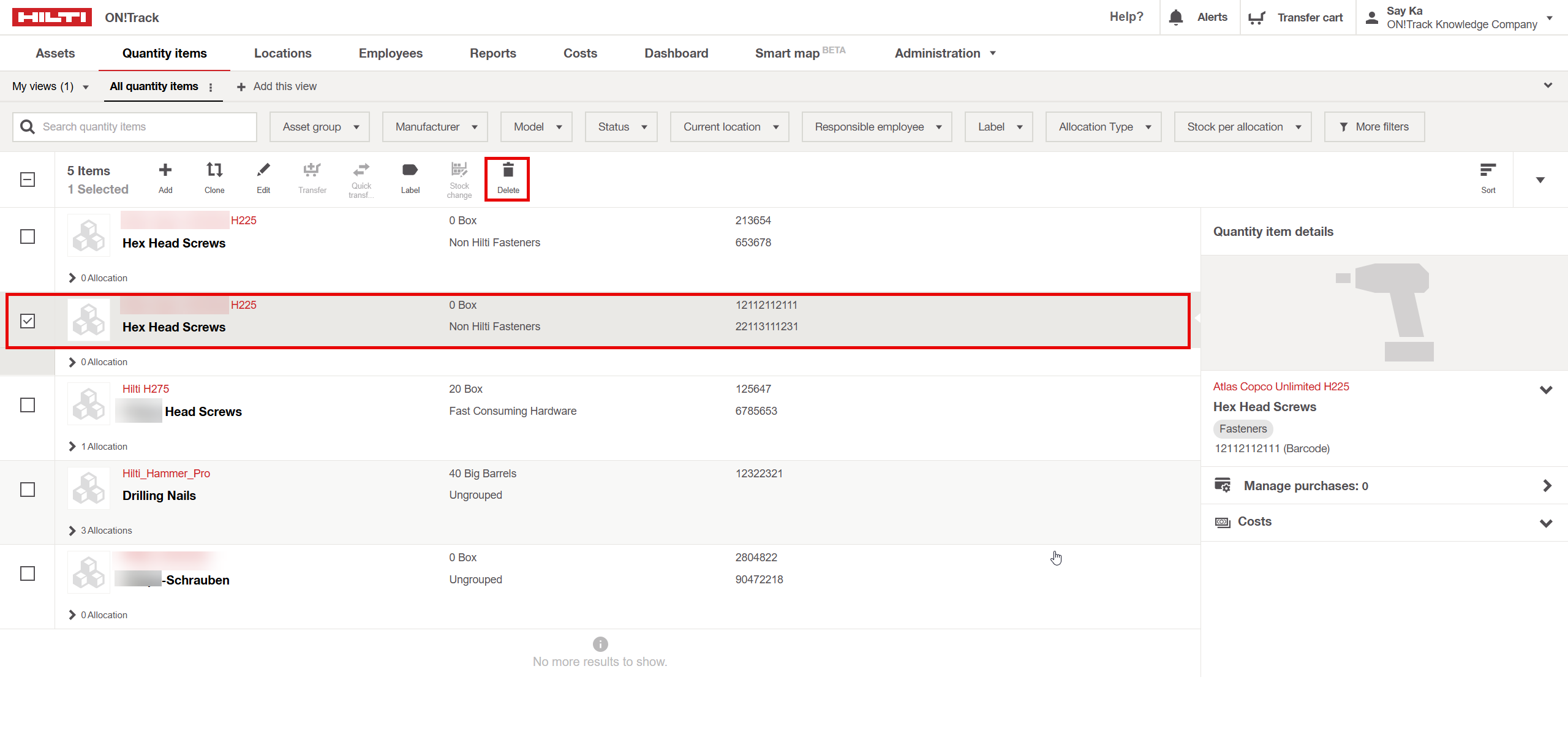 - Select the Quantity Item: Navigate to the quantity items list and select the item you wish to delete.