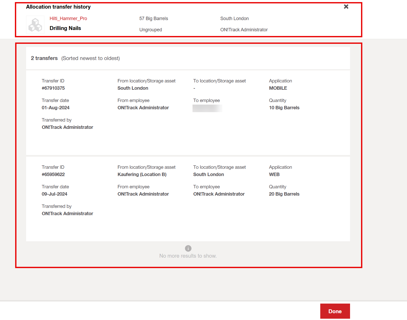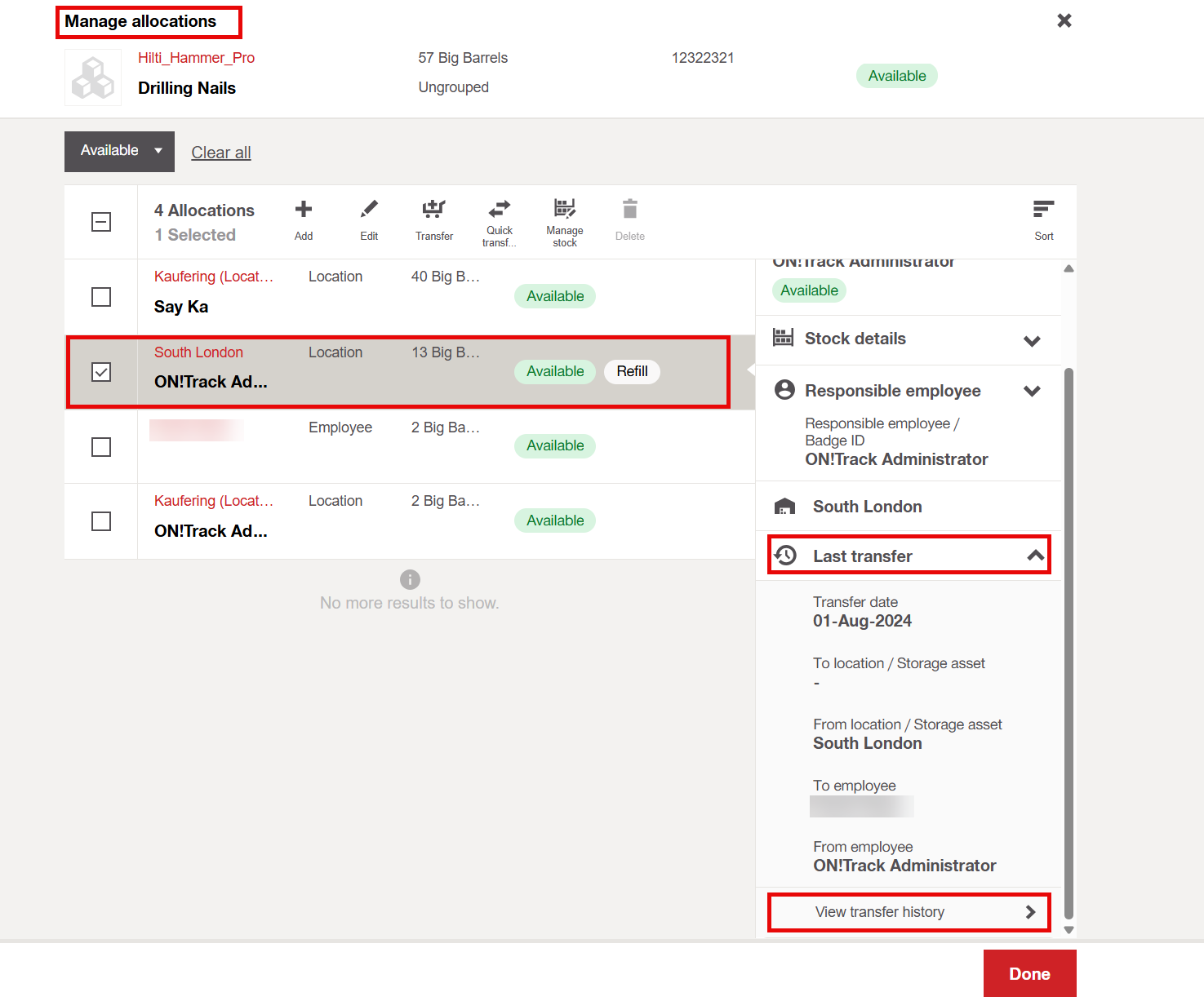 - Open Manage location and open the details for the require allocation and view the transfer history.