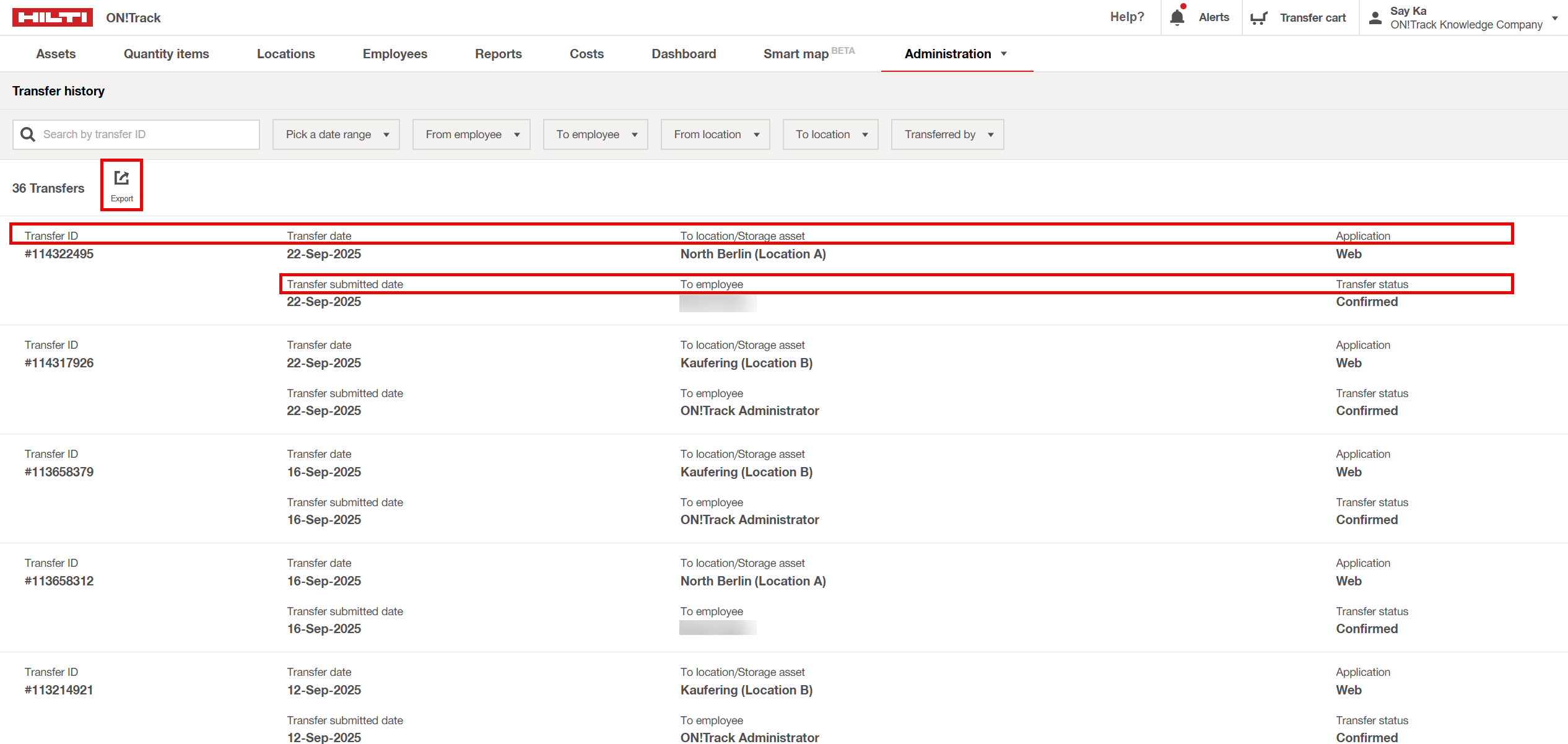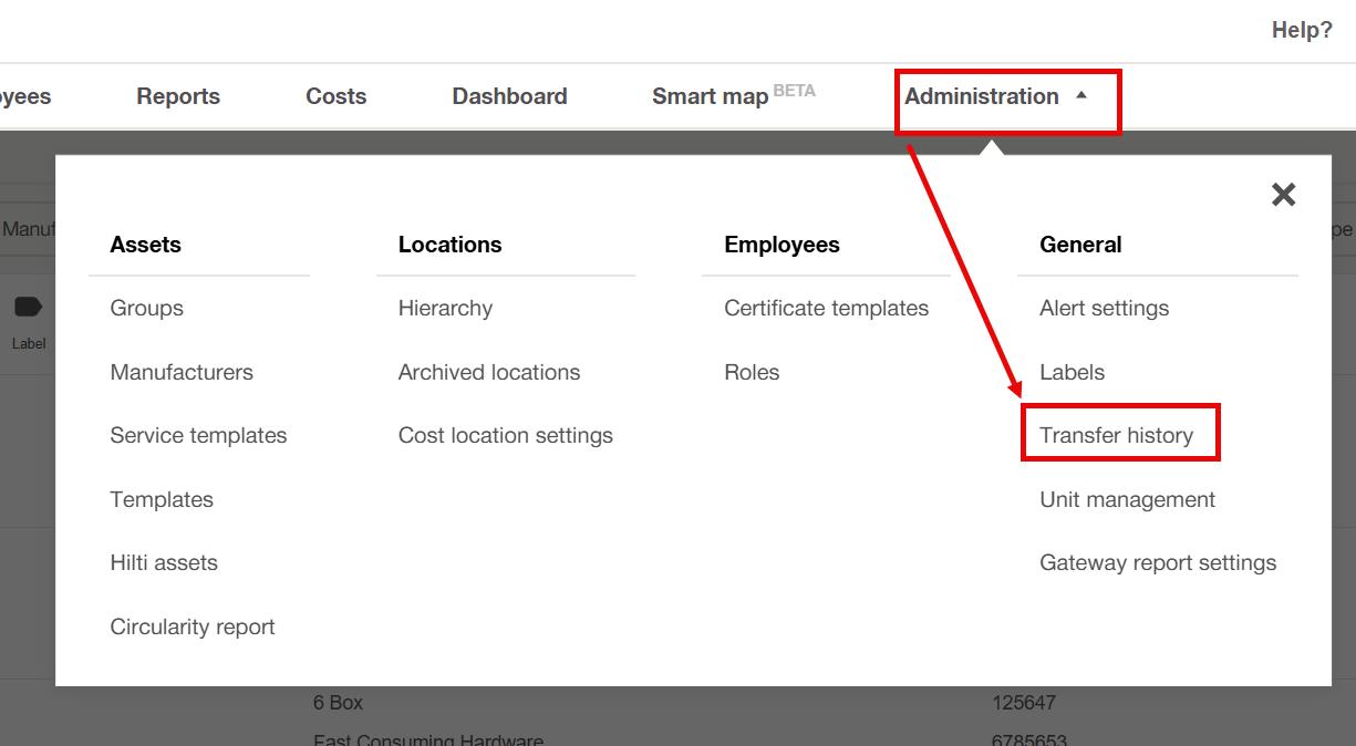 | - Go to the "Administration" tab and select "Transfer History" to see the record of asset transfers.