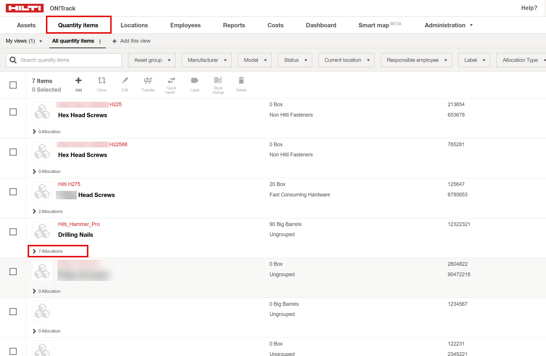 | Transfer | - Select the Quantity Item (QI) you want to transfer and click on the transfer option.