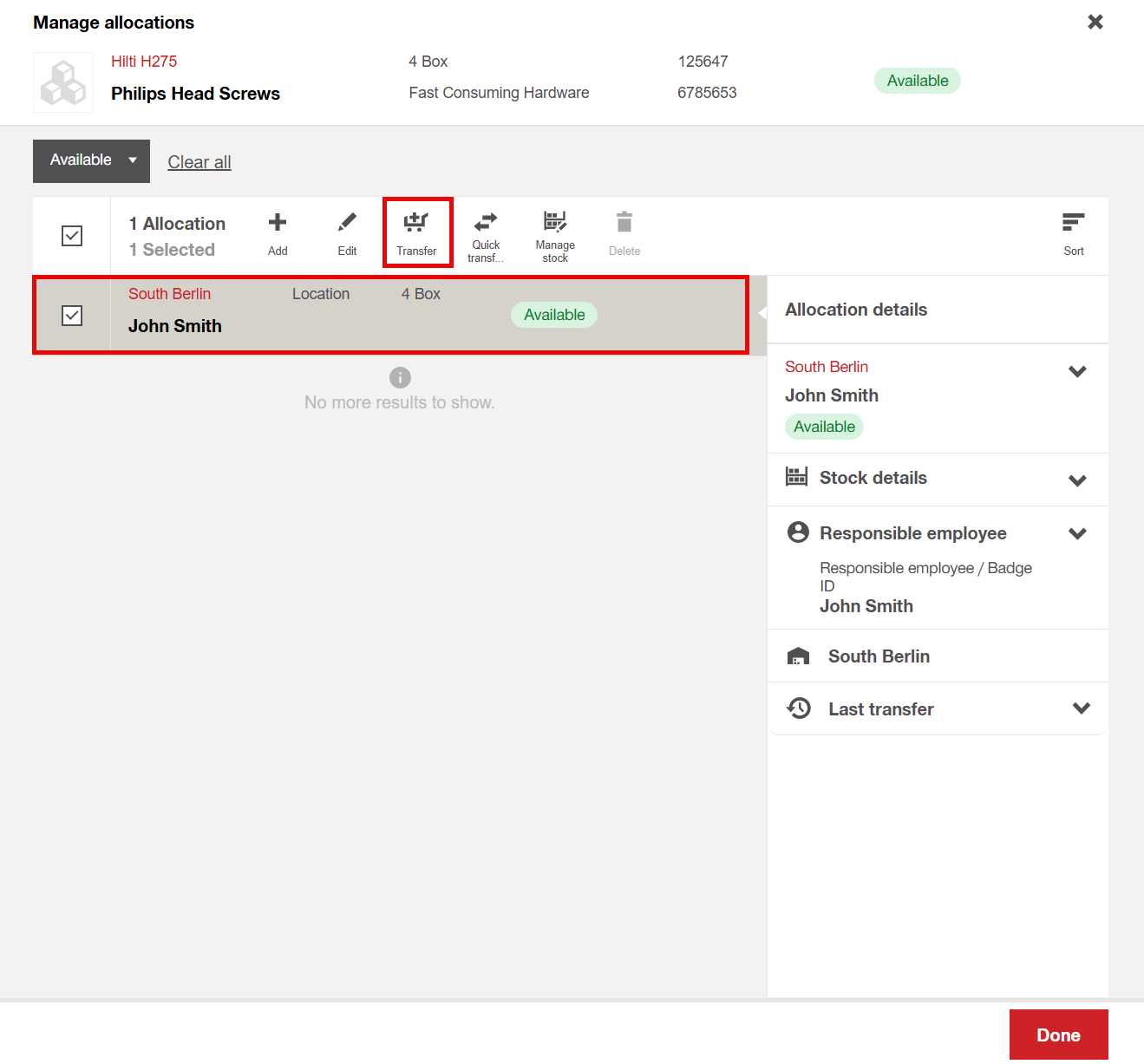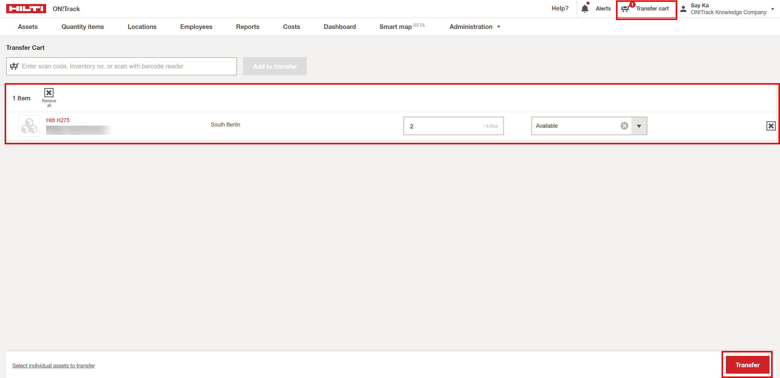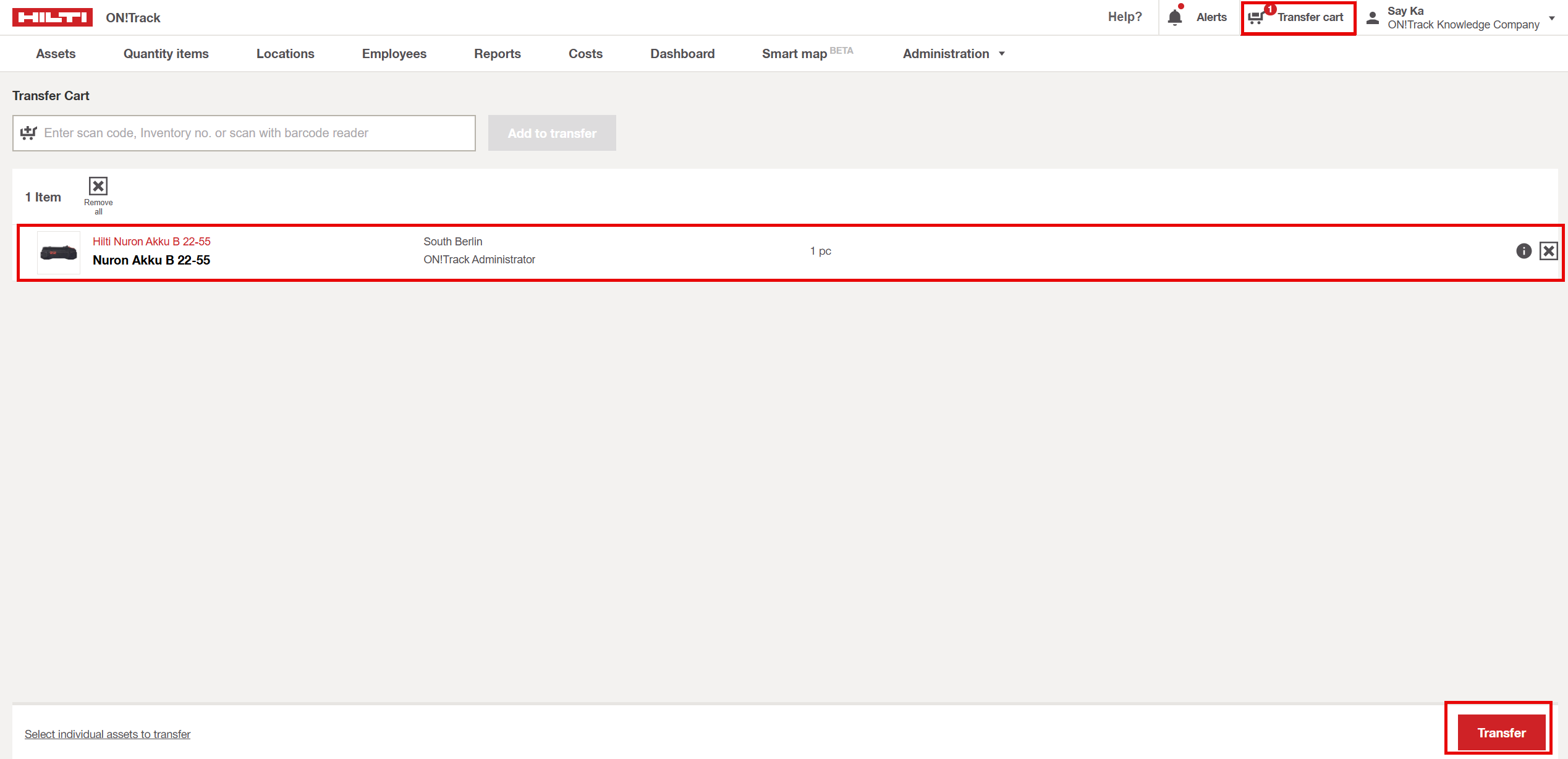 - To transfer an asset, simply confirm the selected item(s) and click "Transfer" to move them to the desired location.
