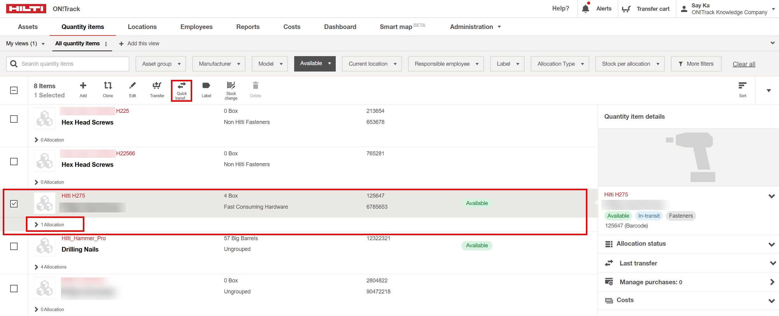 | Quick Transfer | - Select the Quantity Item (QI) you want to transfer and click on the quick transfer.