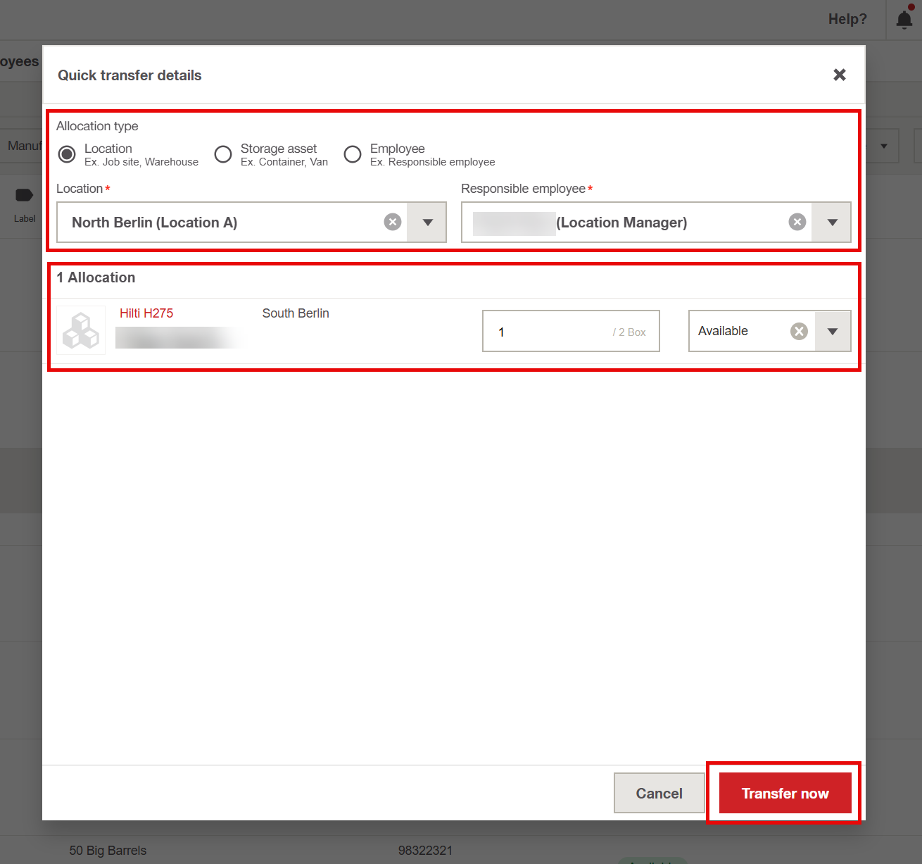 - Choose the Allocation type and fill out the required details where the item will be moved. Click on transfer now to transfer the quantity item.
