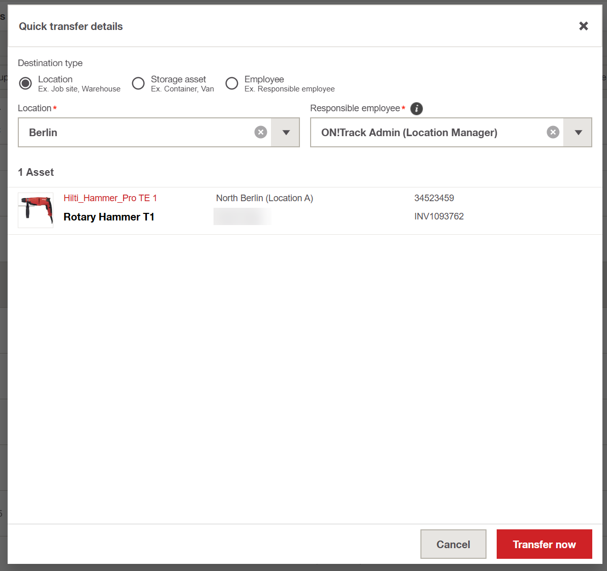 - Confirm the asset and fill out the required details where the asset will be moved. Click on transfer now.