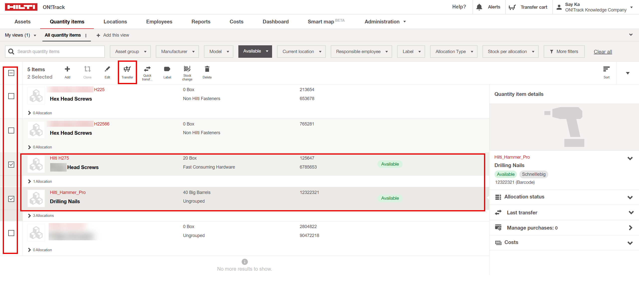 - Open the Quantity Item List View, select the items you want to transfer using multiselect, then click the transfer button to begin.