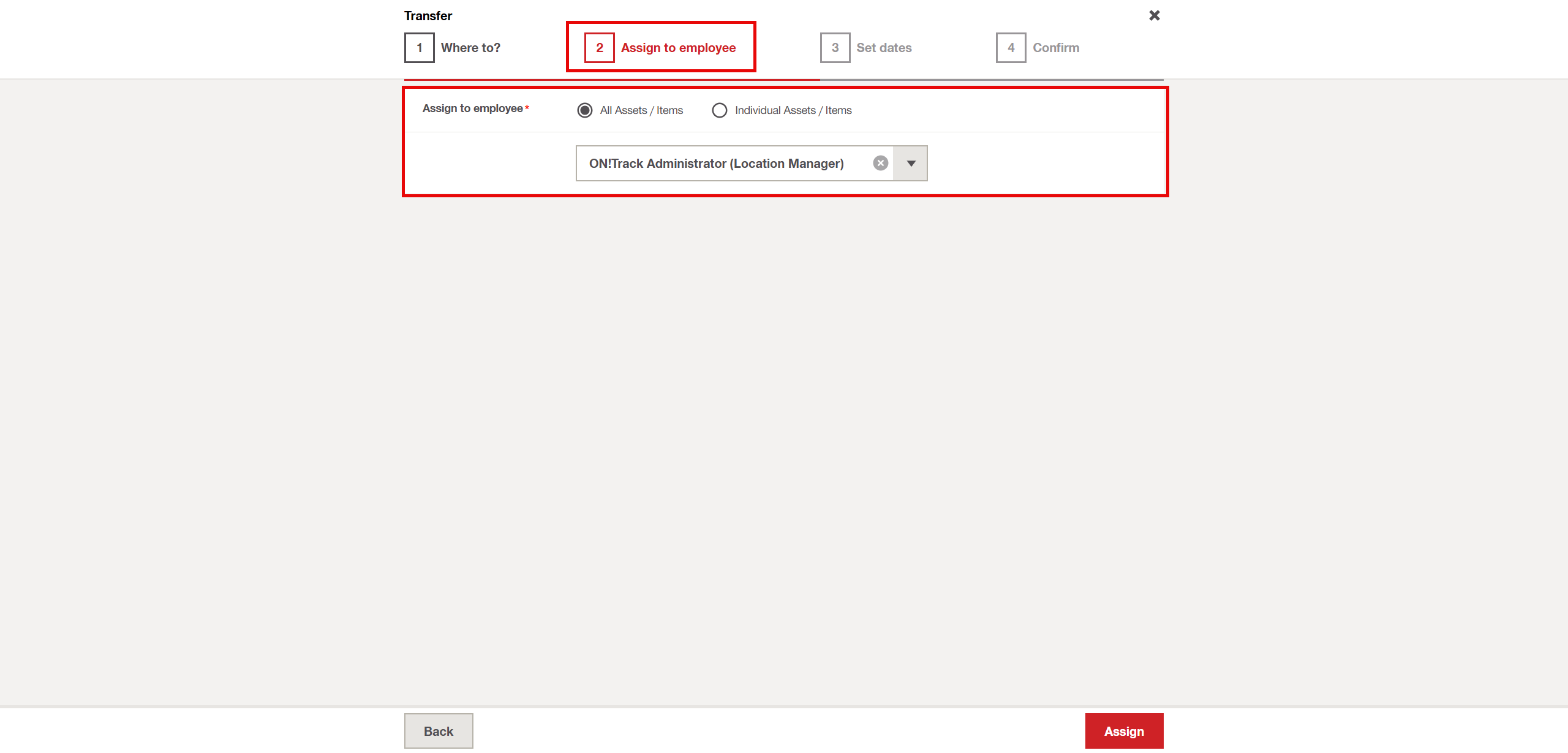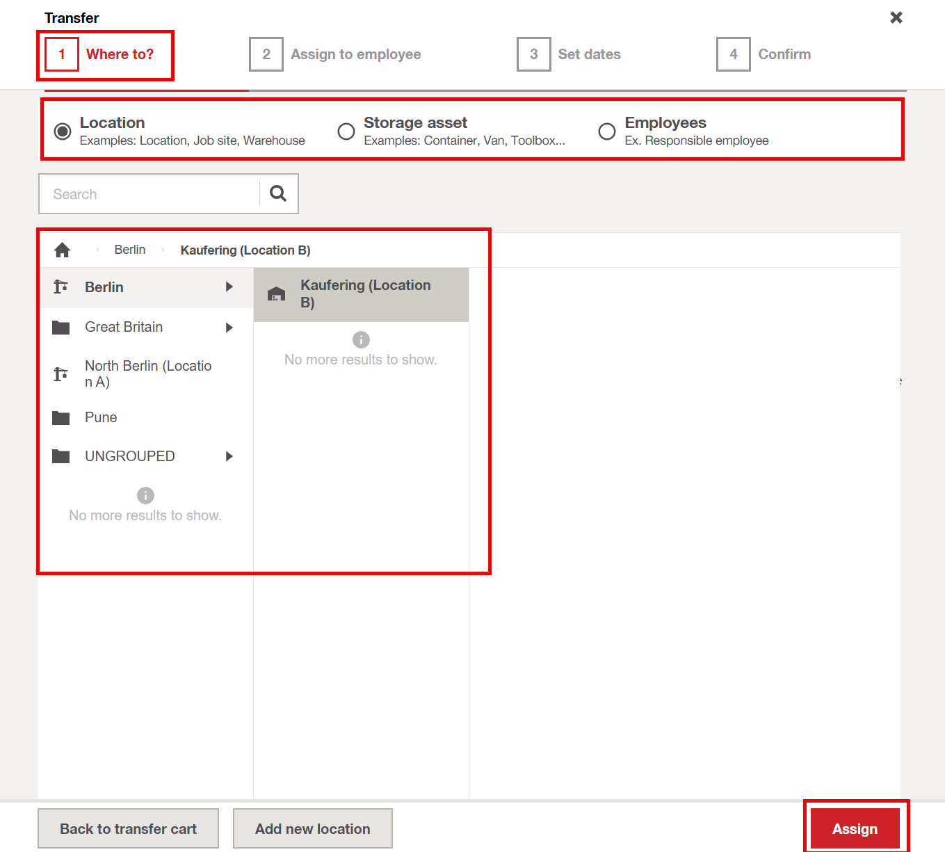 - In the transfer details, pick where you want to send the items, this could be a warehouse, jobsite, storage asset, or worker. Click on Assign.