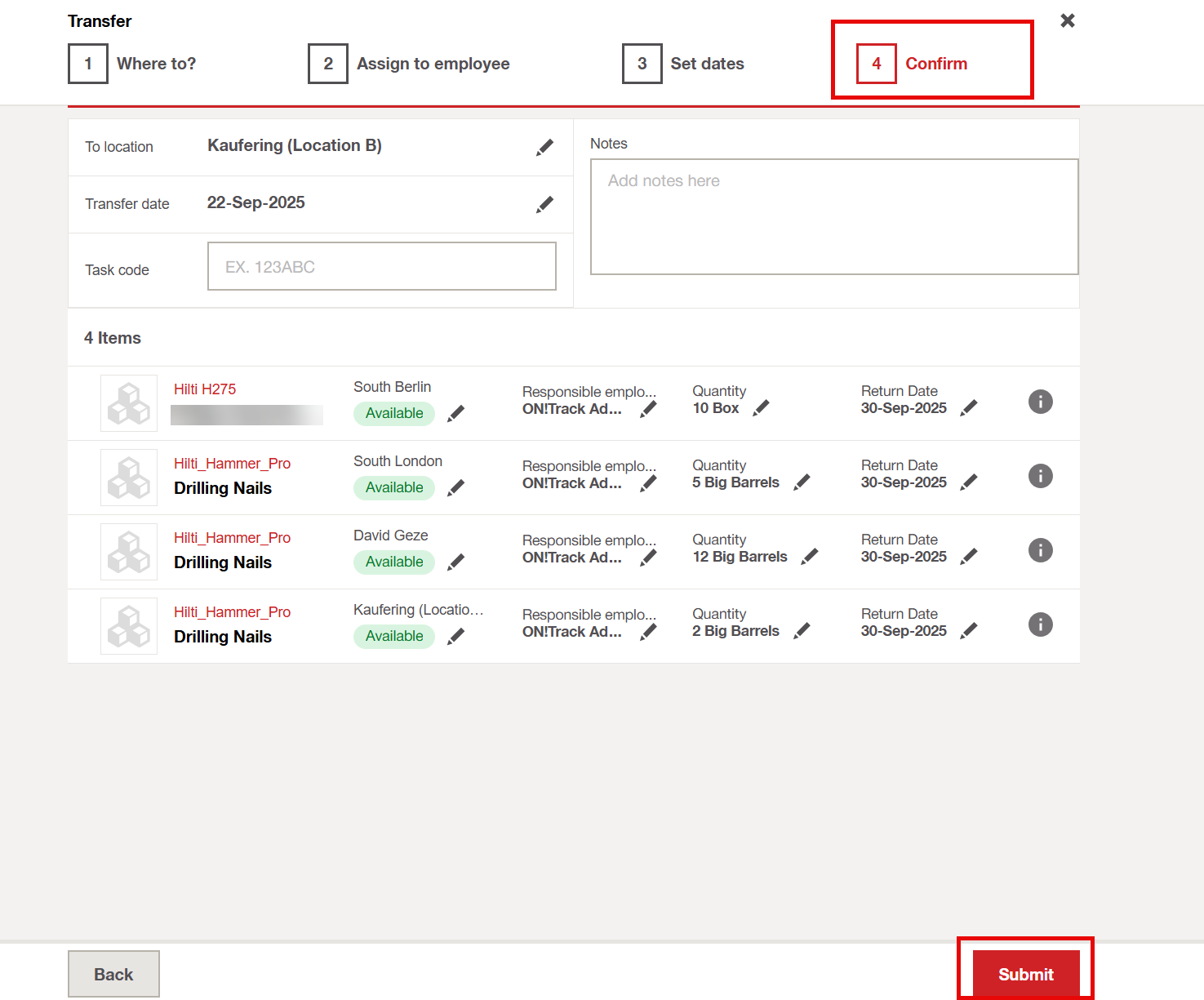 - Set the transfer dates and return dates (optional) for all items or individual items depending on the requirement.