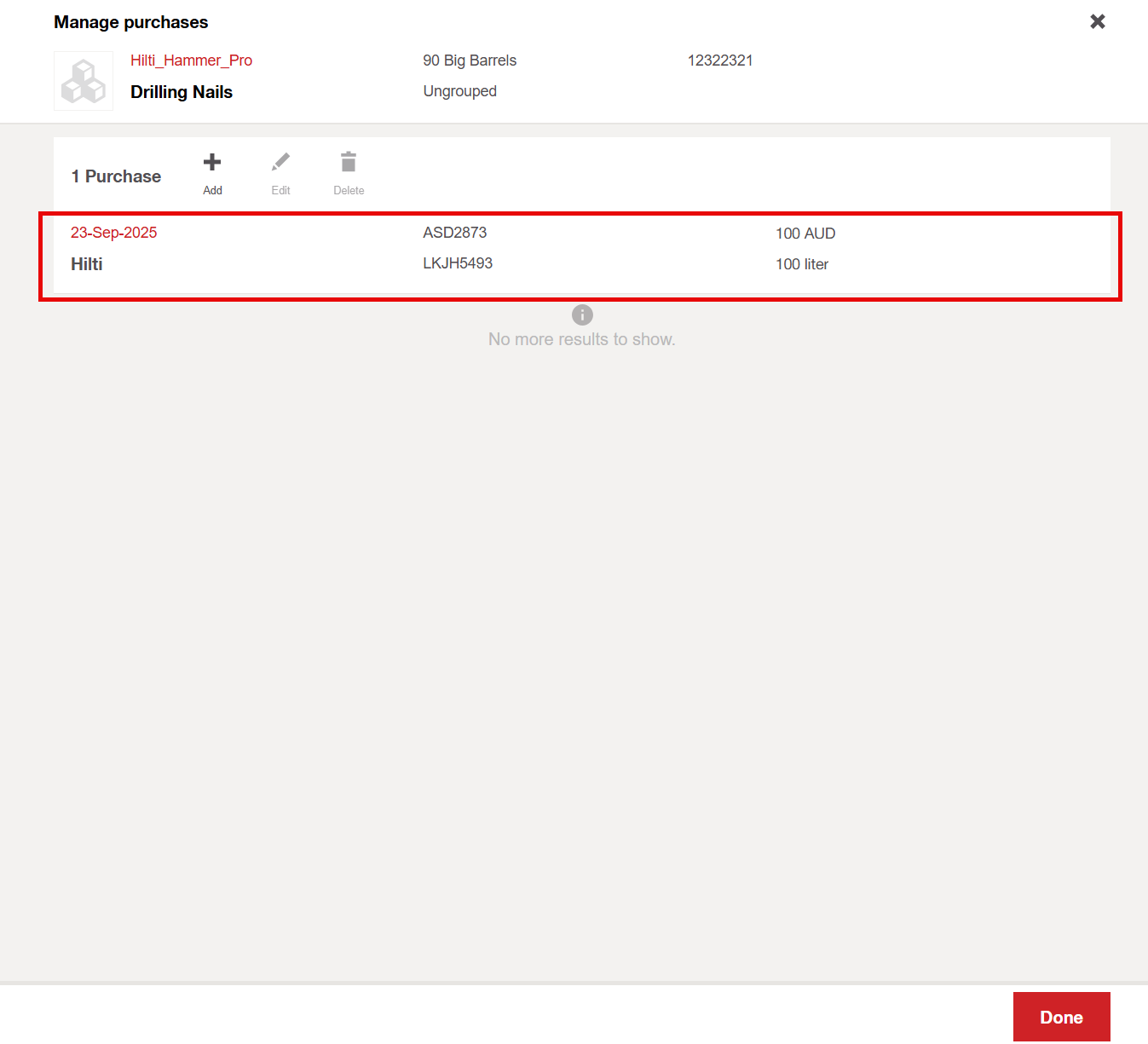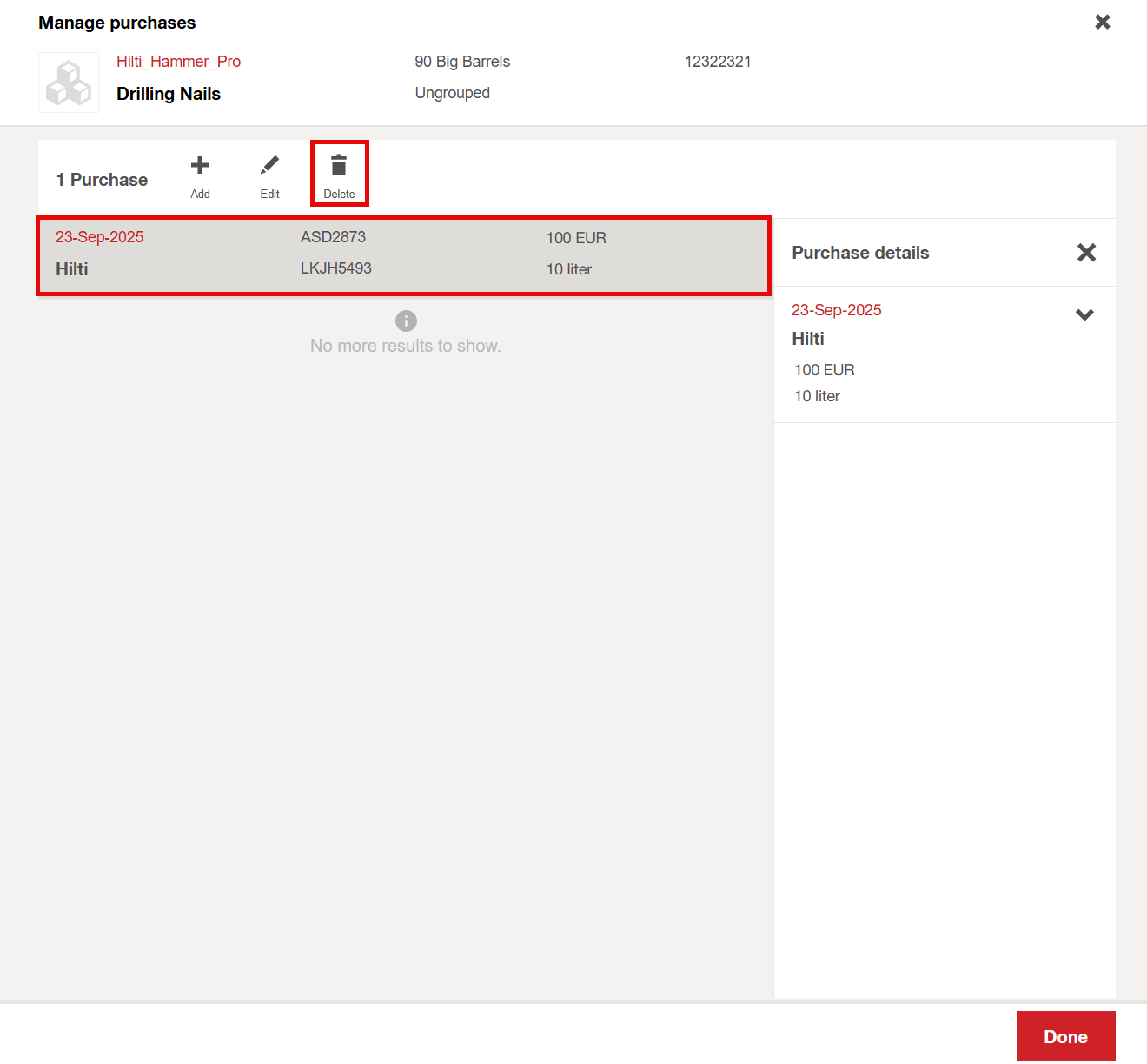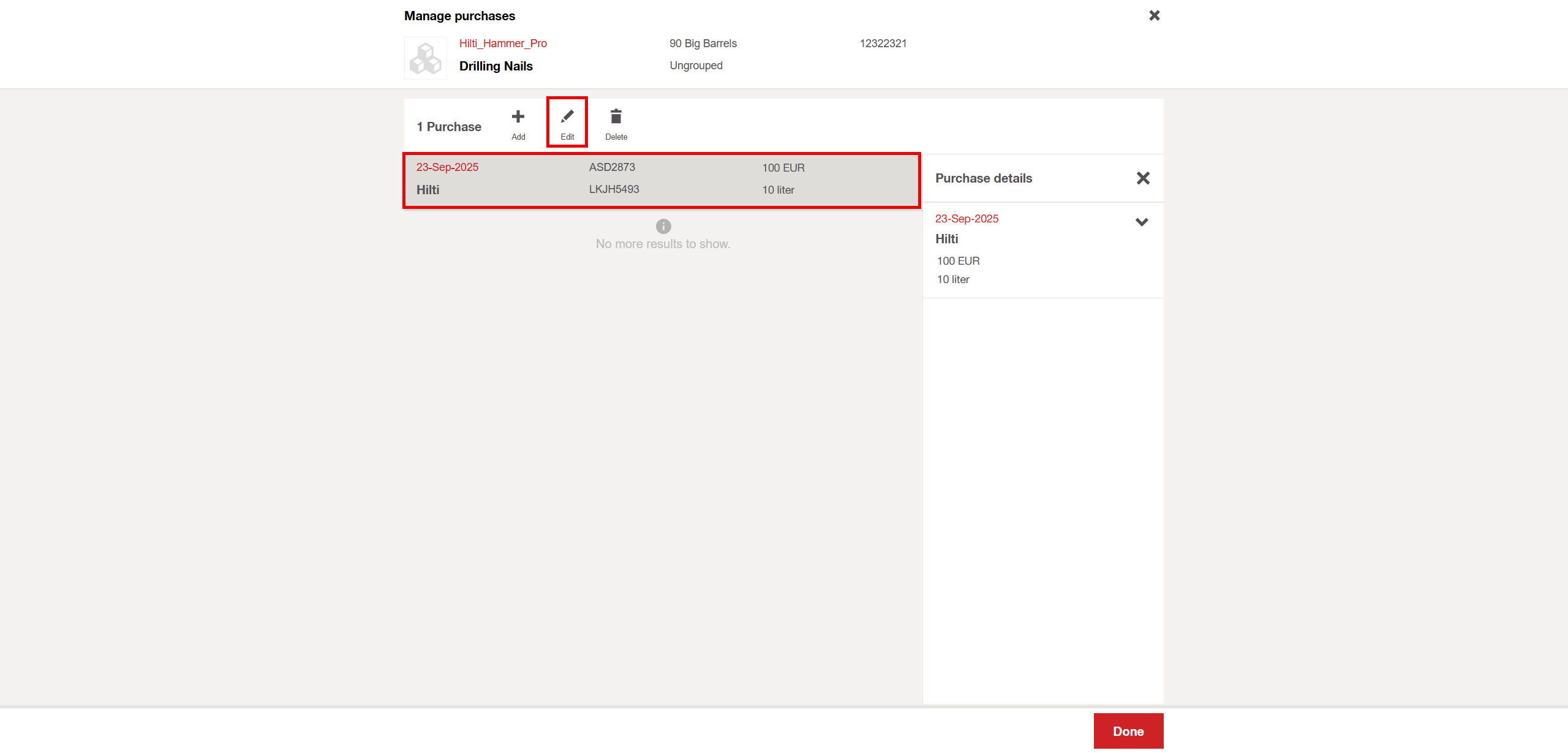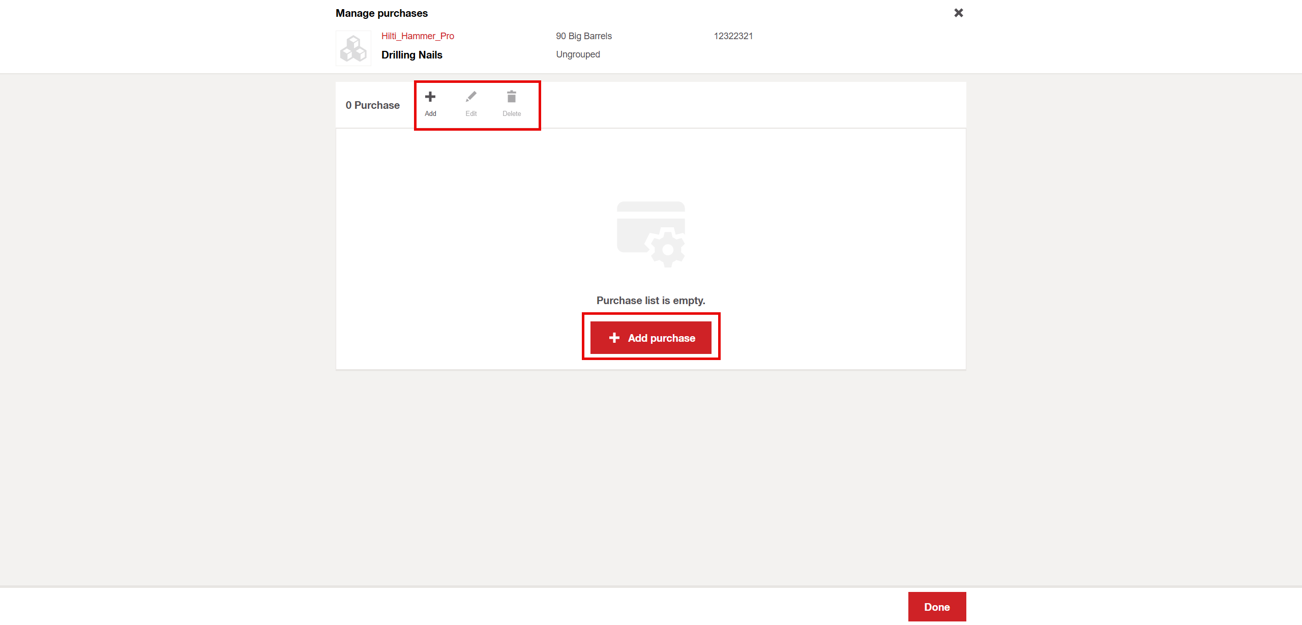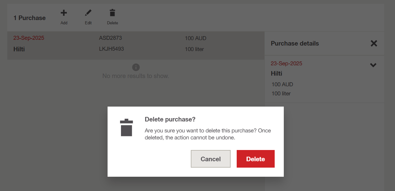 - Here you can add, edit and delete purchases. Please note: only one purchase can be deleted at a time.