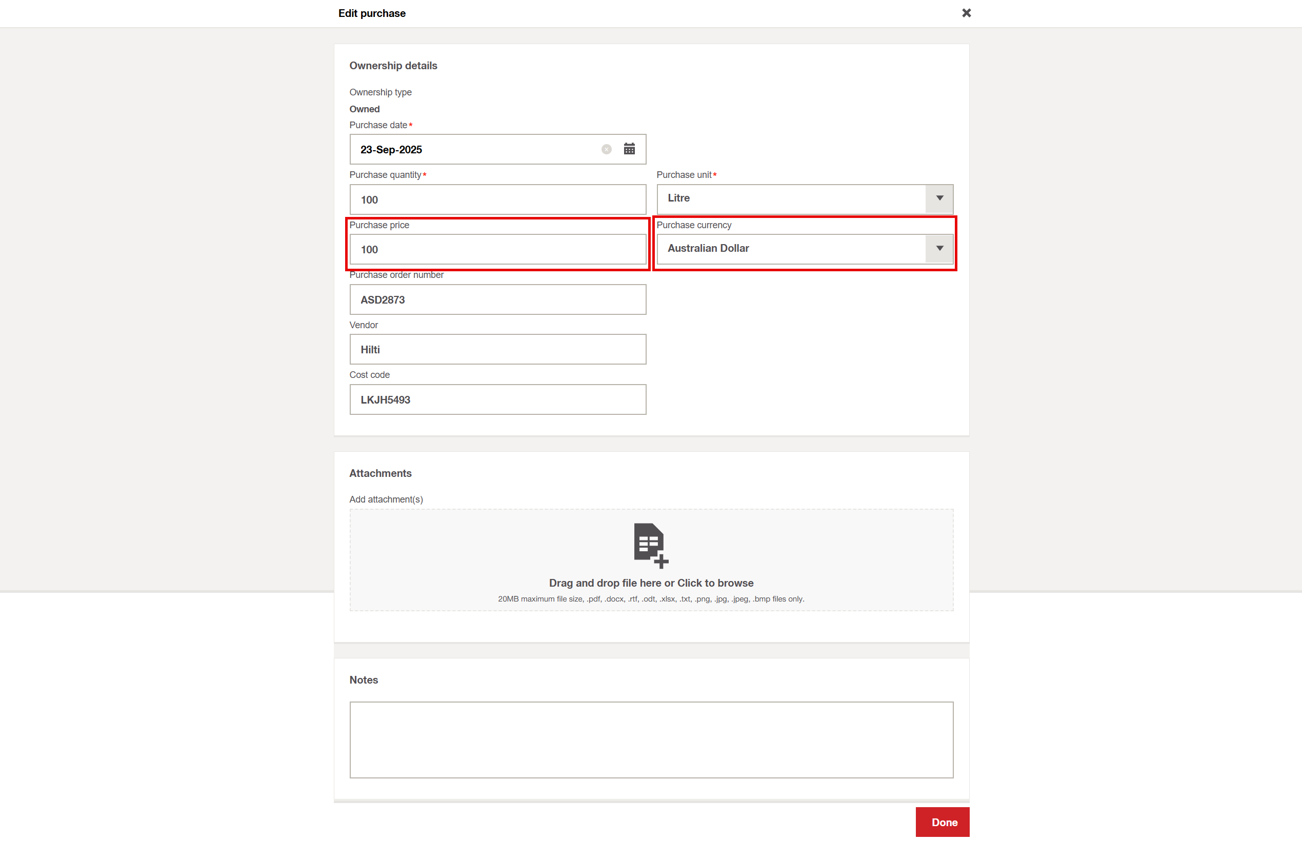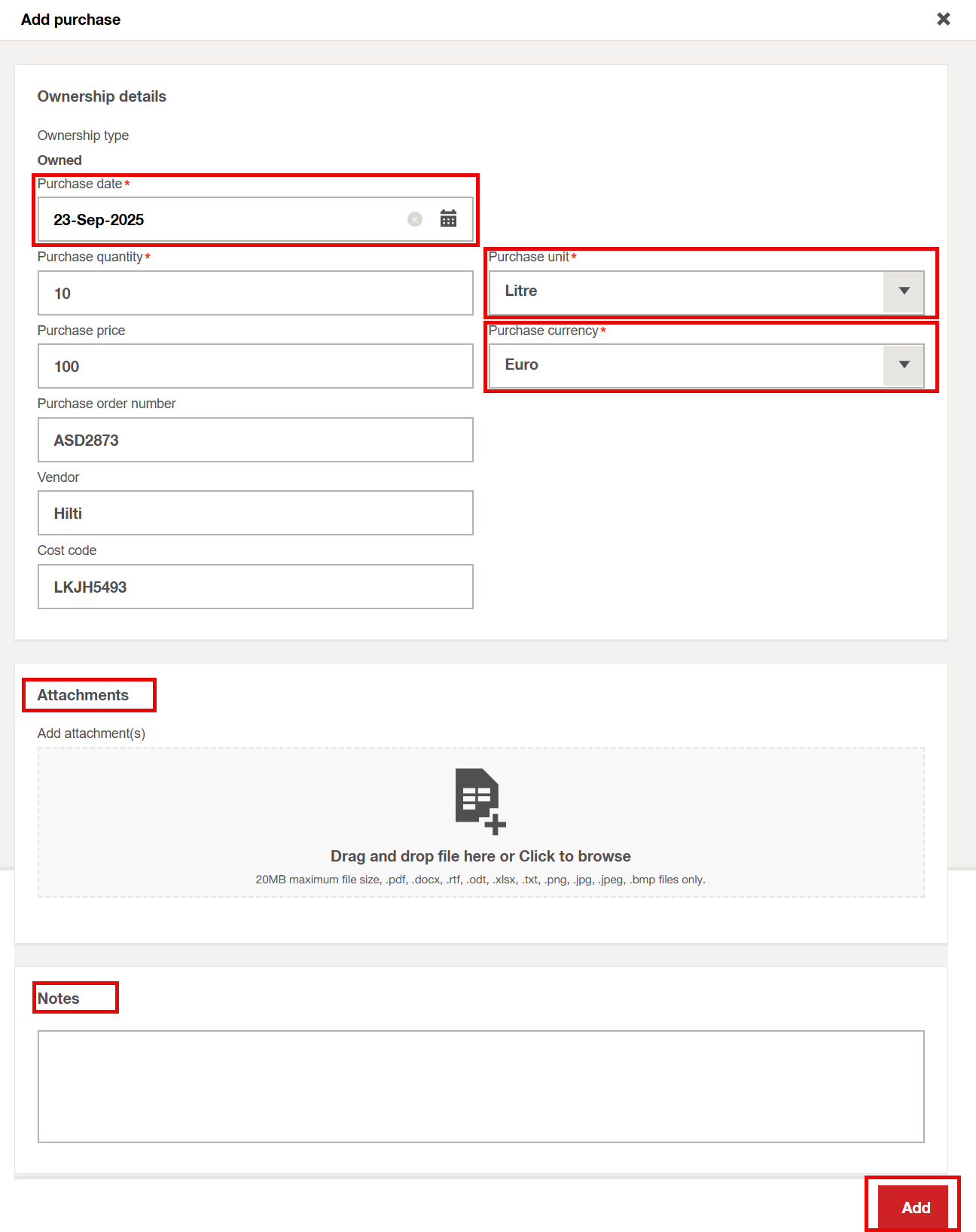 - Fill in the required fields, Purchase date, Purchase quantity, and Purchase unit.