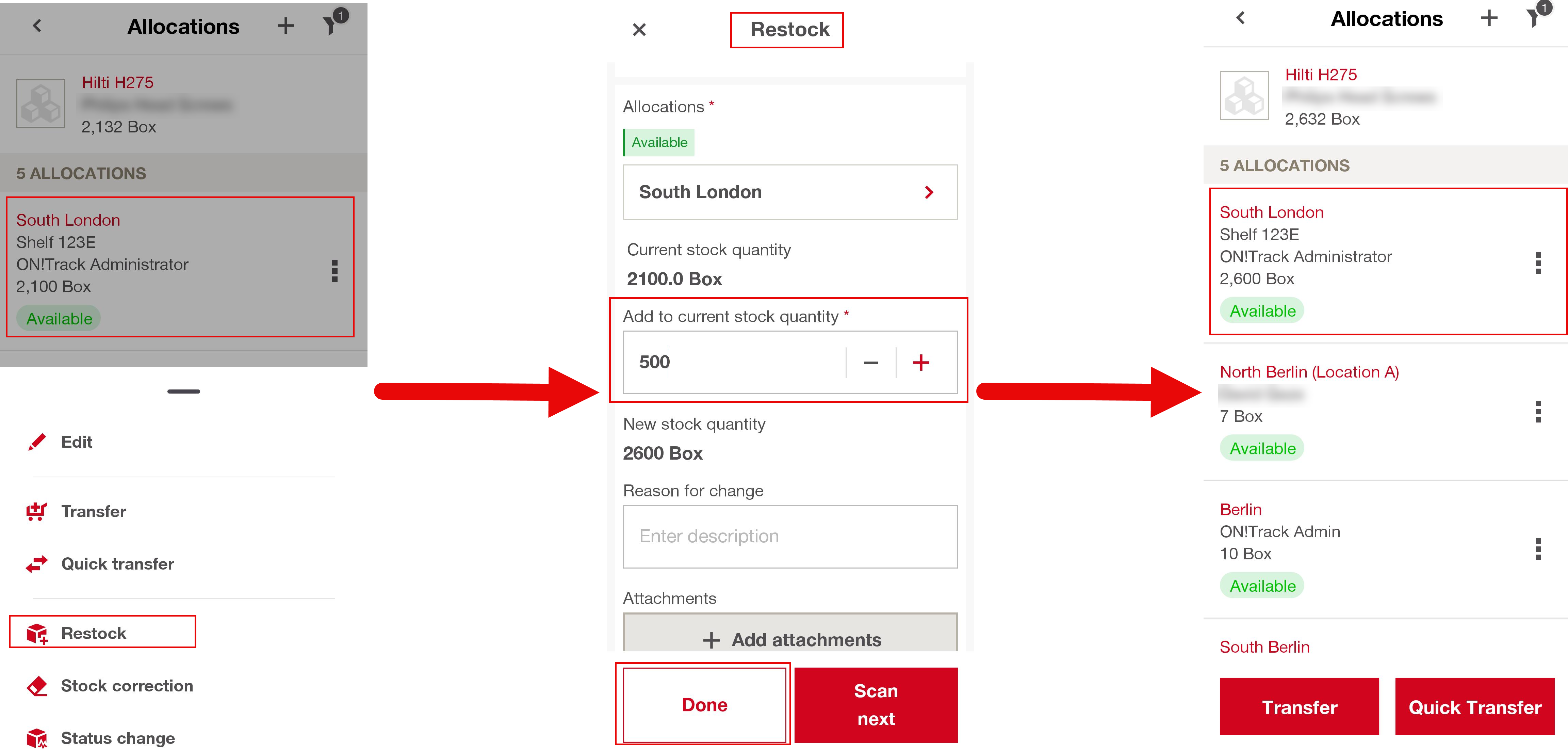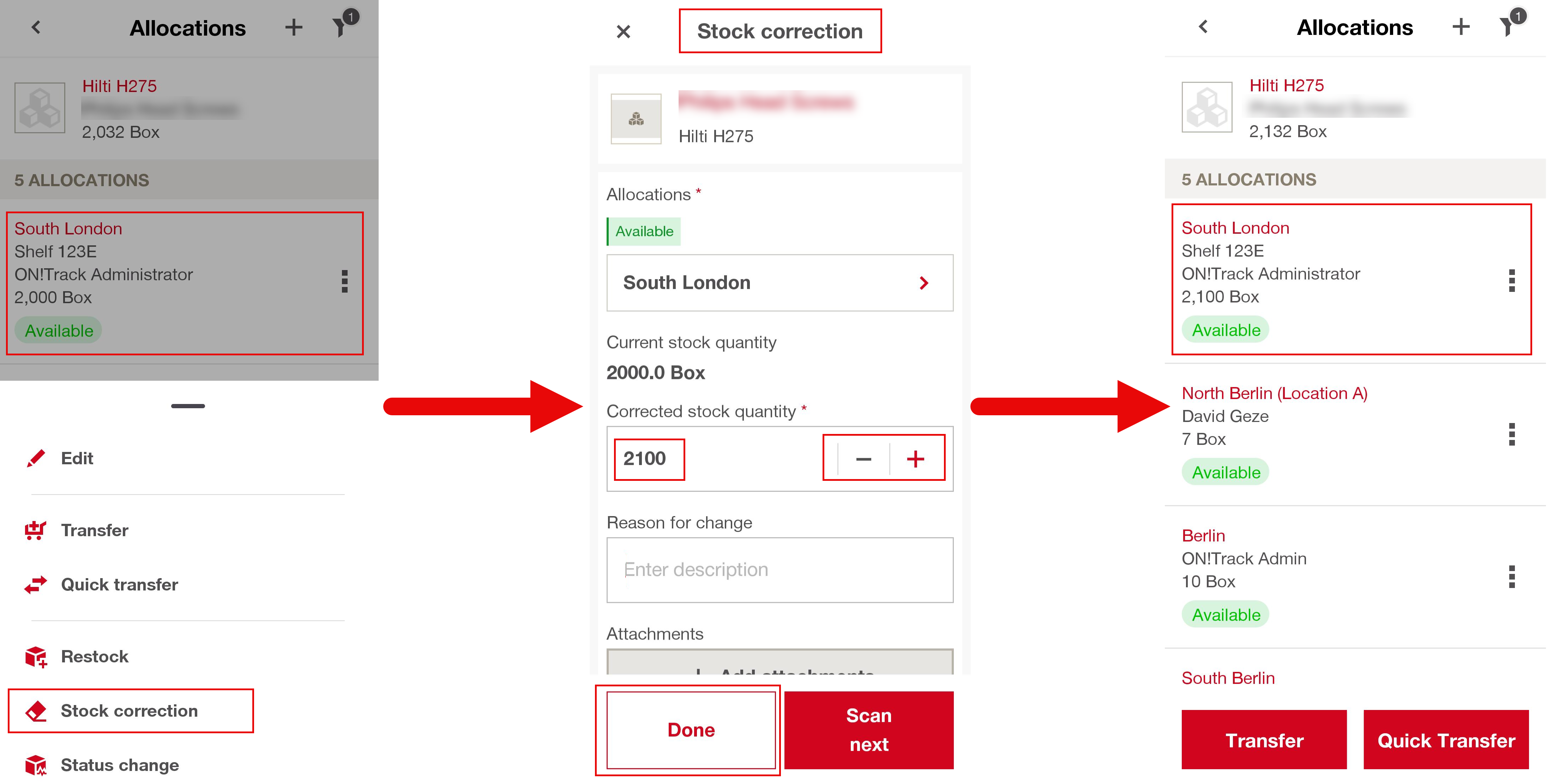 - Add optional reason and attachment fields and click done to save to update stock levels.