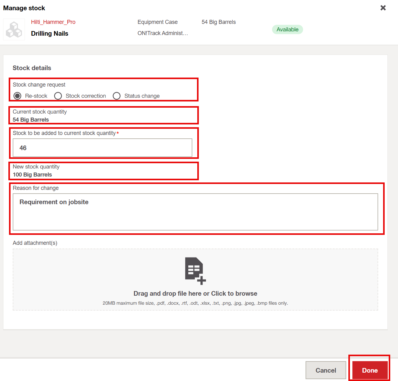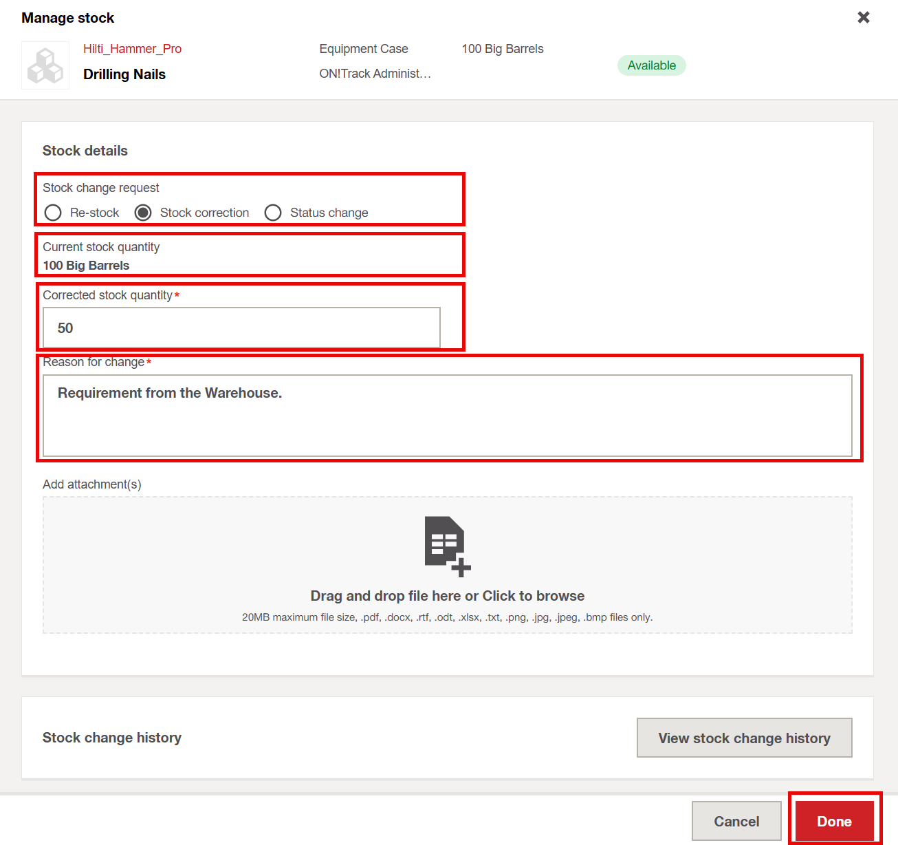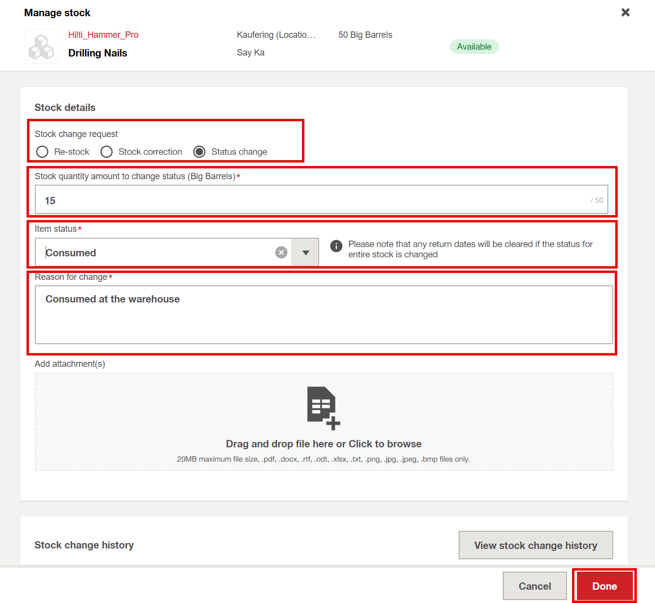 - Enter a quantity greater than zero, select the new status, add a reason for the change, and click Done to save.